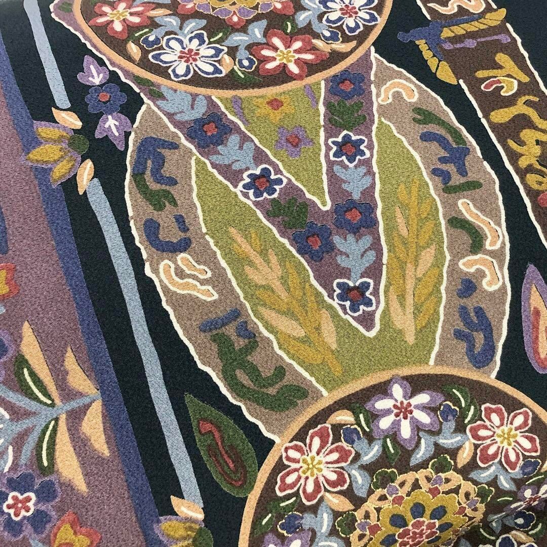 青墨色の縮緬地に彩りの鮮やかな抽象的な花柄模様がデザインされた素敵なお品でございます。