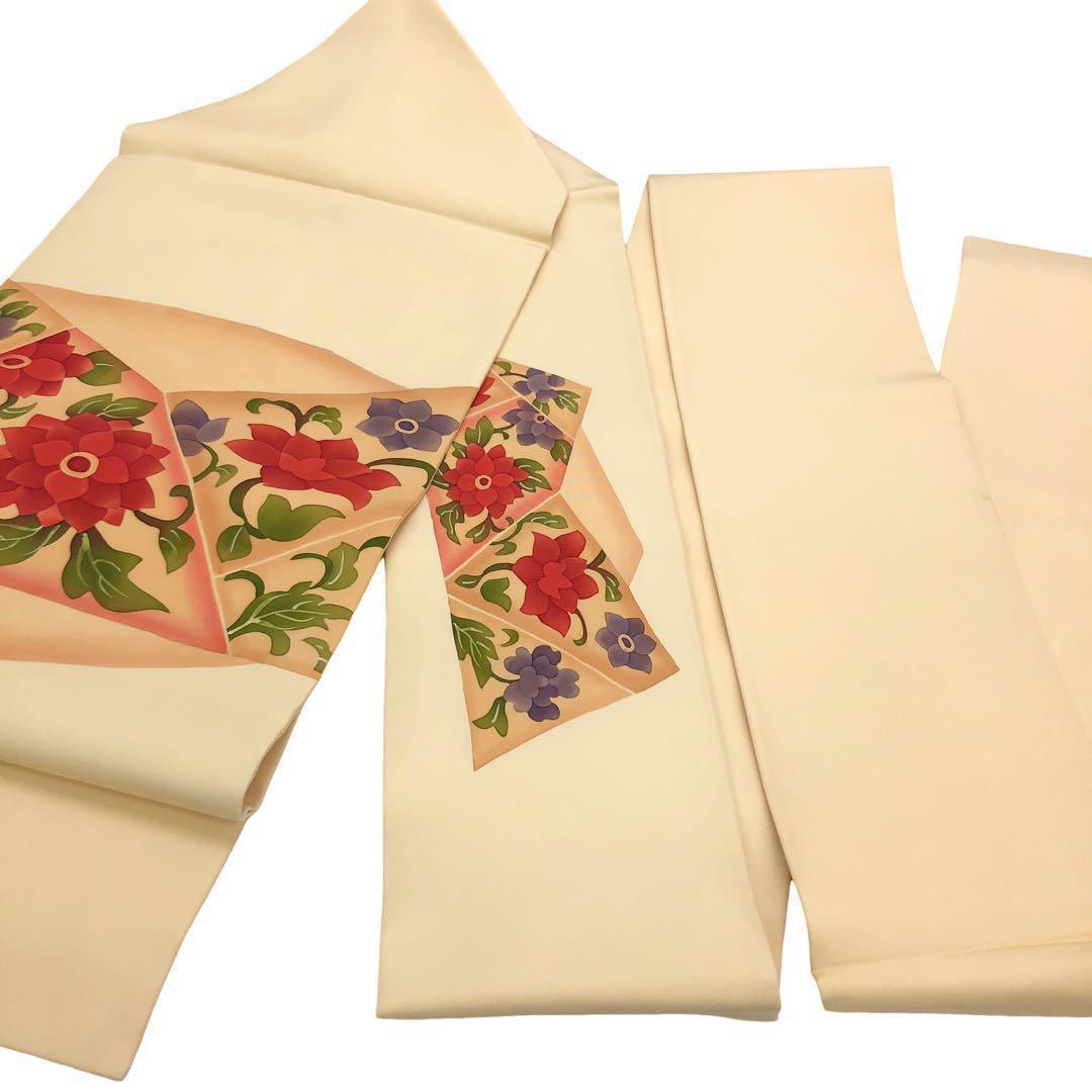 薄卵色の品のあるお色味の塩瀬に彩り鮮やかな花柄模様がデザインされた素敵なお品でございます。