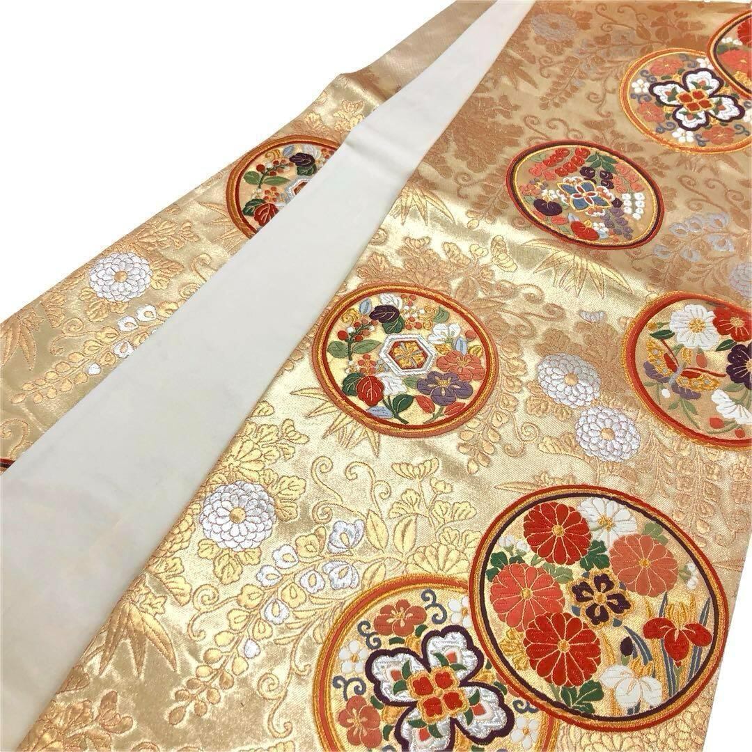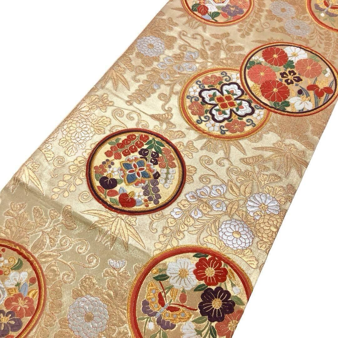 金銀糸を使った金色ベースのお色味に丸の中に鮮やかな花模様がデザインされた素敵なお品でございます。