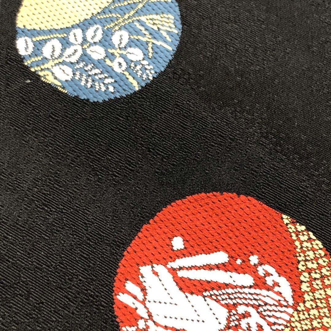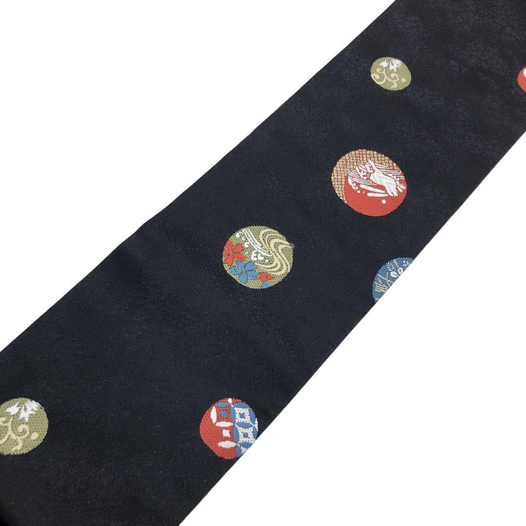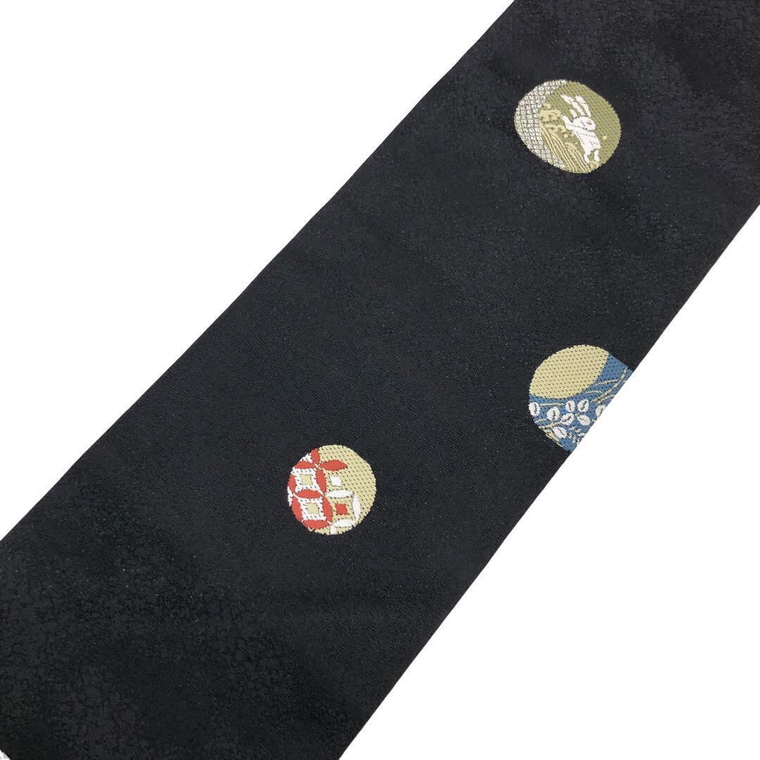 名古屋帯 丸に色彩豊かな柄裄 うさぎ 月 花模様 七宝 黒色 O-3191