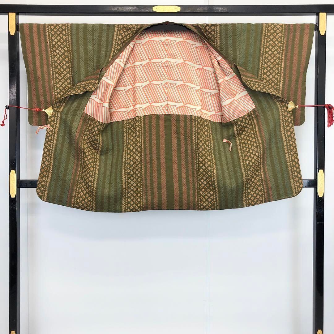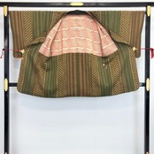千歳茶色の縮緬に三色の淡いお色味の縞模様に鹿の子絞りの柄裄がデザインされた素敵なお品でございます。