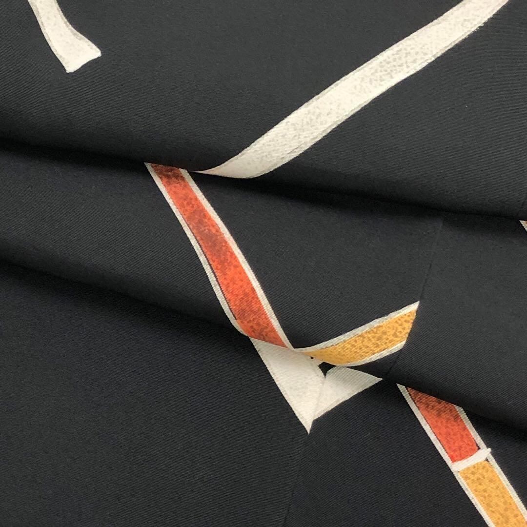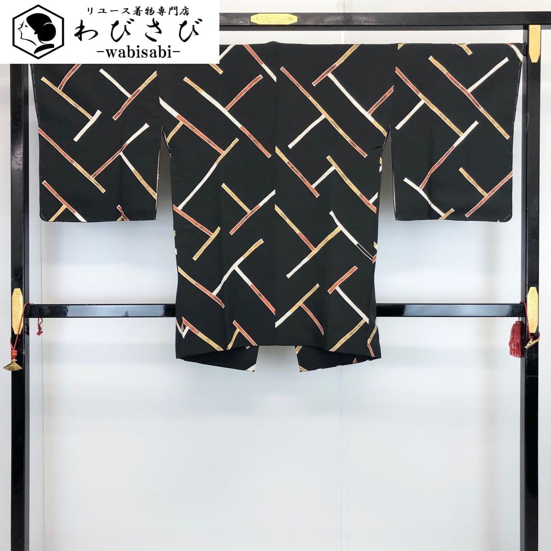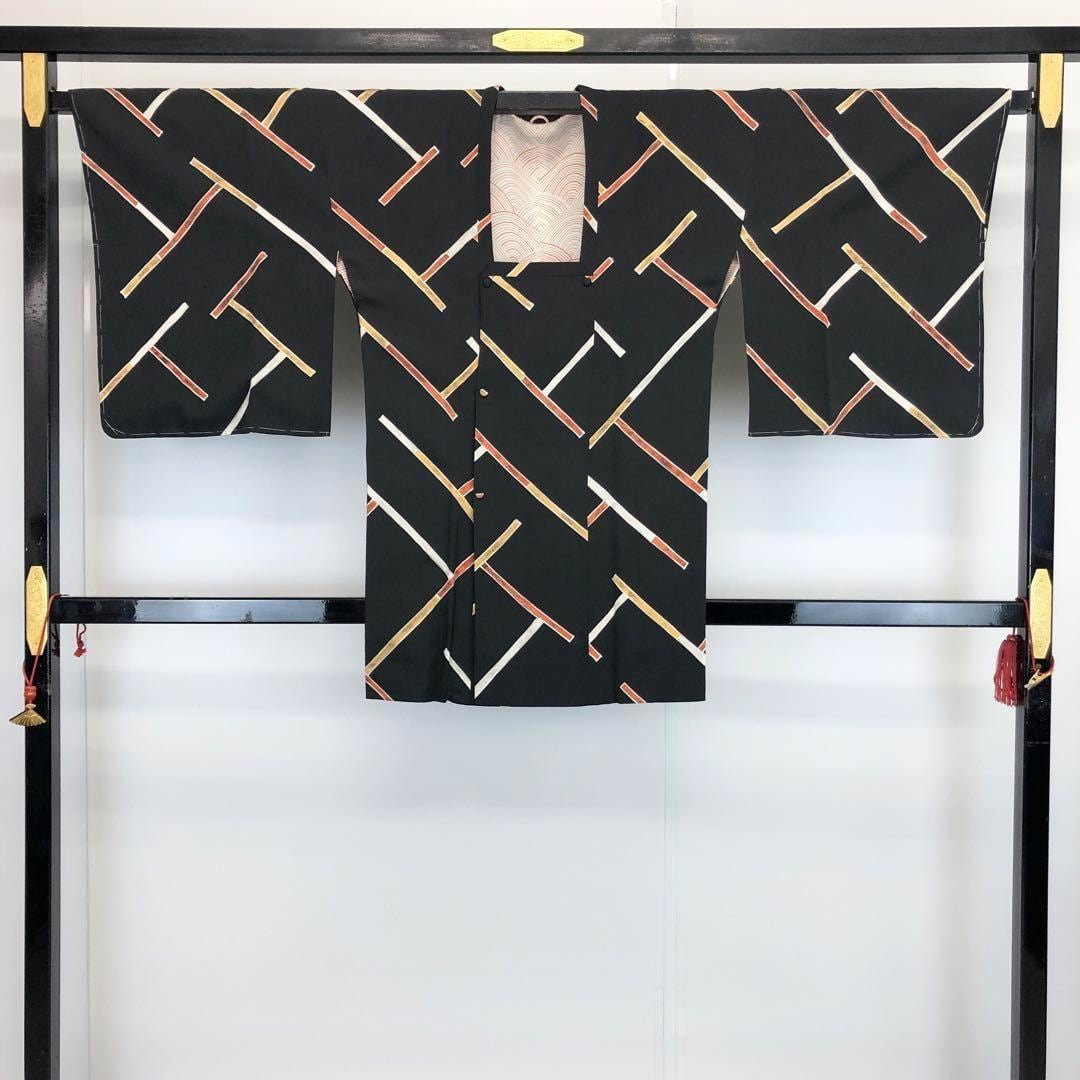 黒色のお色味に赤黄白色の斜めの線模様の組み合わせた柄裄が素敵なお品でございます。
