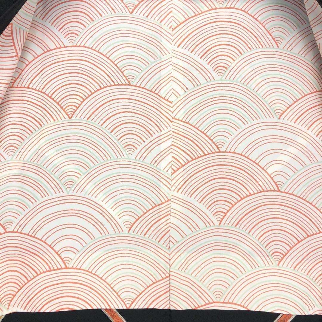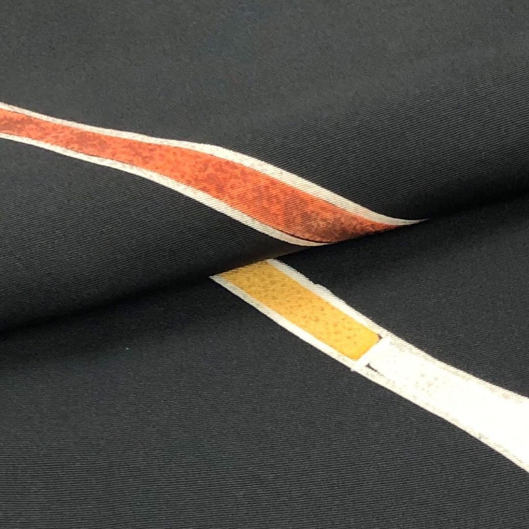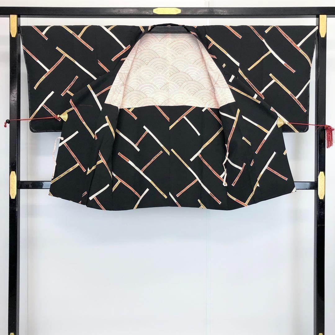 黒色のお色味に赤黄白色の斜めの線模様の組み合わせた柄裄が素敵なお品でございます。