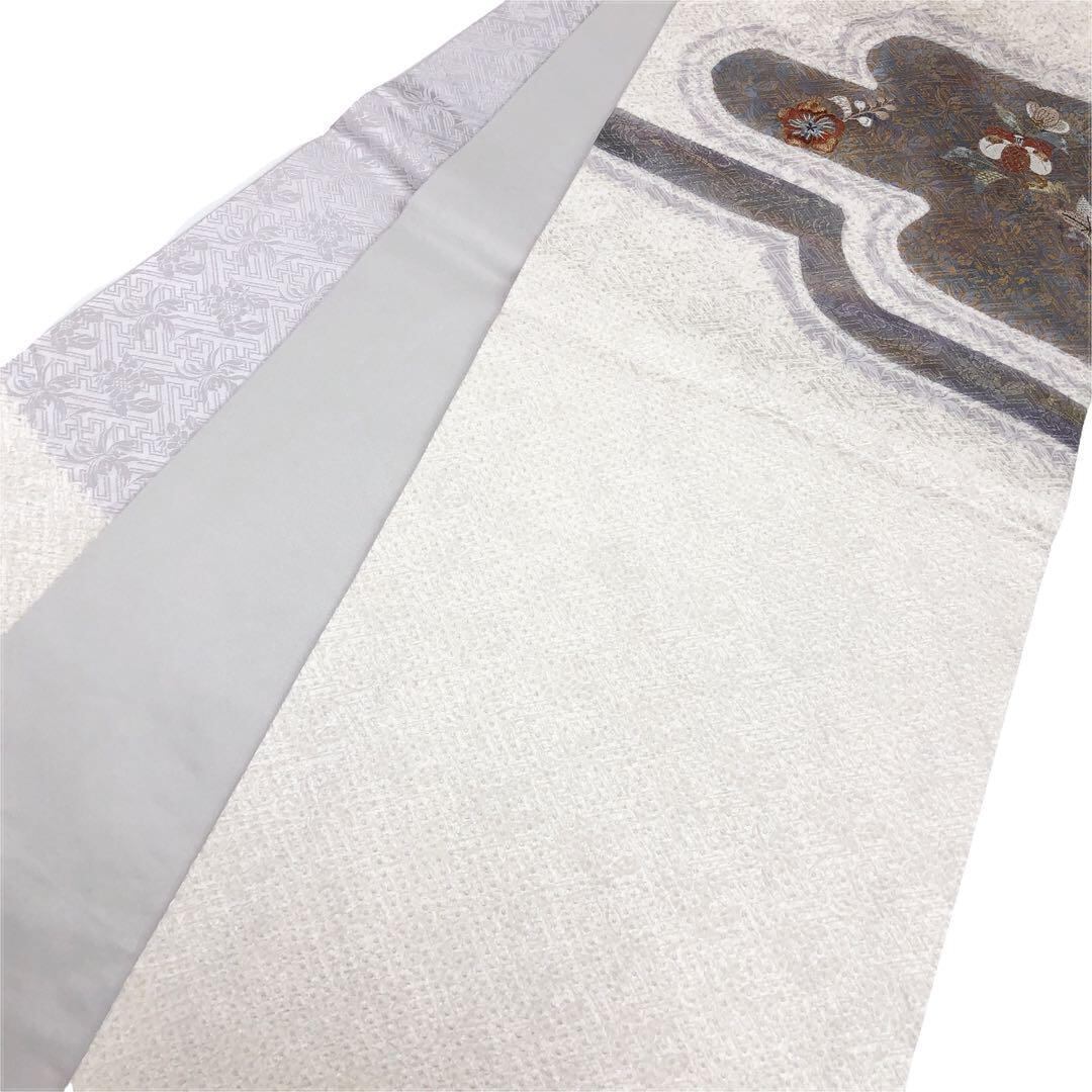 乳白色の上品なお色味に紗綾形の地模様、絞り、刺繍でデザインされた霞模様に花柄が素敵なお品でございます。