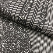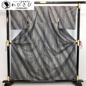 モノトーンのお色味に斜めの縞花模様、縦柄縞模様がデザインされたモダンで素敵な柄裄のお品でございます。