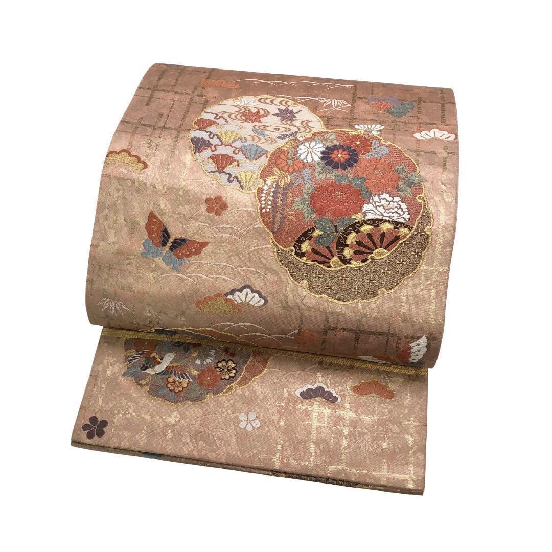 金糸が使われた格子模様、蝶々、松、雪輪の中に花車などの柄行がデザインされた素敵なお品でございます。