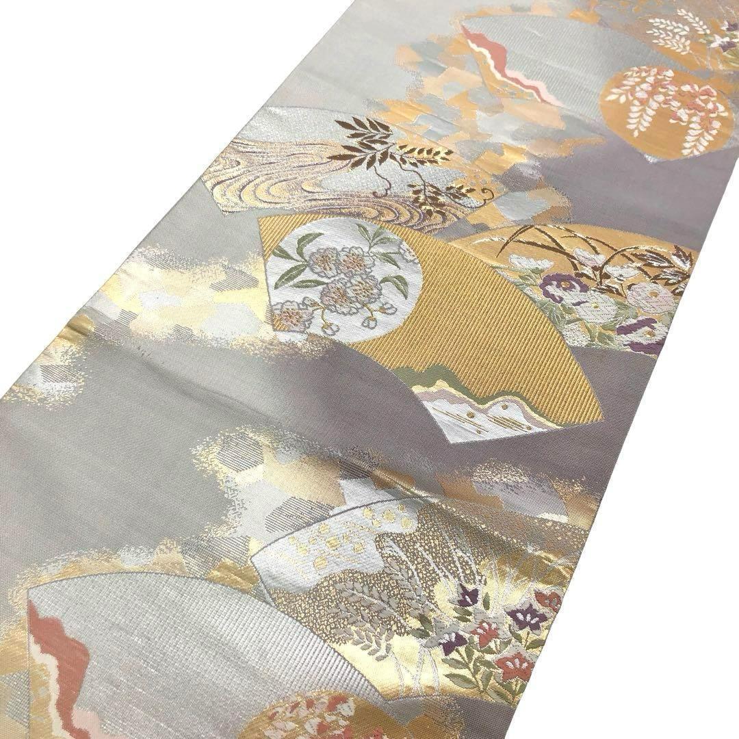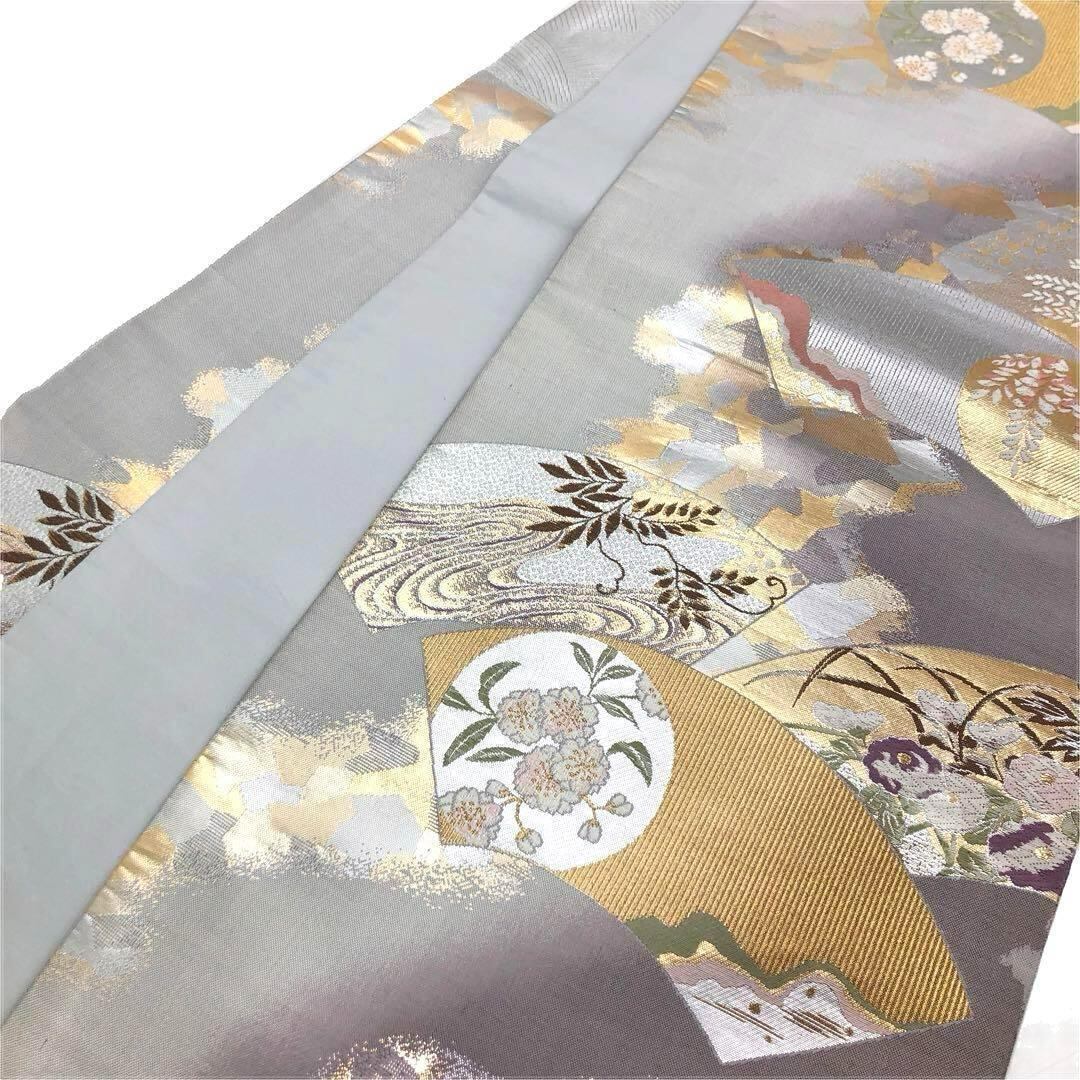 淡いグラデーションのお色味、地紙に四季の花模様、満月などの柄裄がデザインされた素敵なお品でございます。