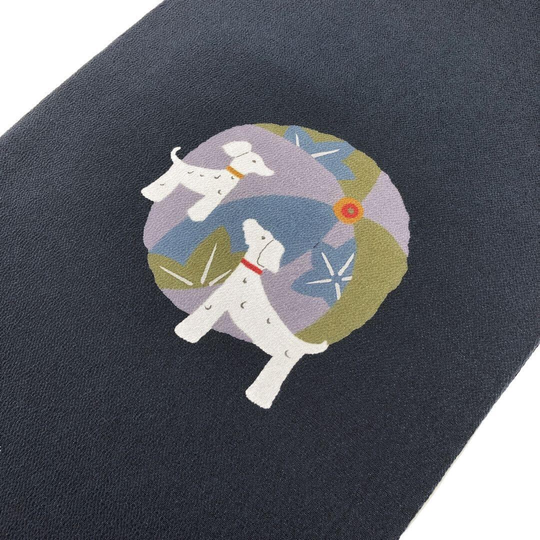 名古屋帯 手毬にかわいい犬柄 縮緬 鋼色 O-3220