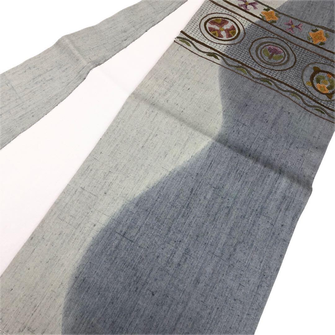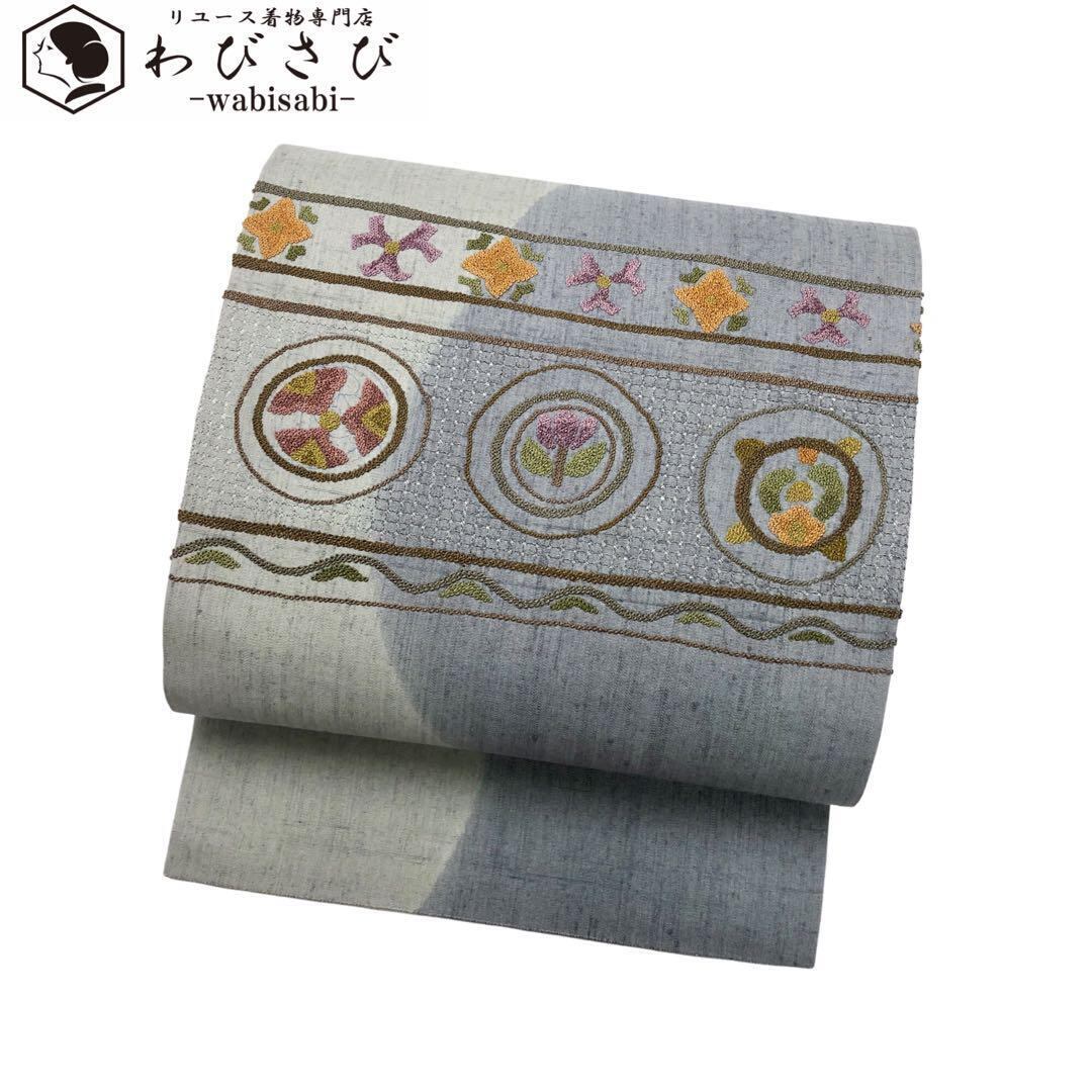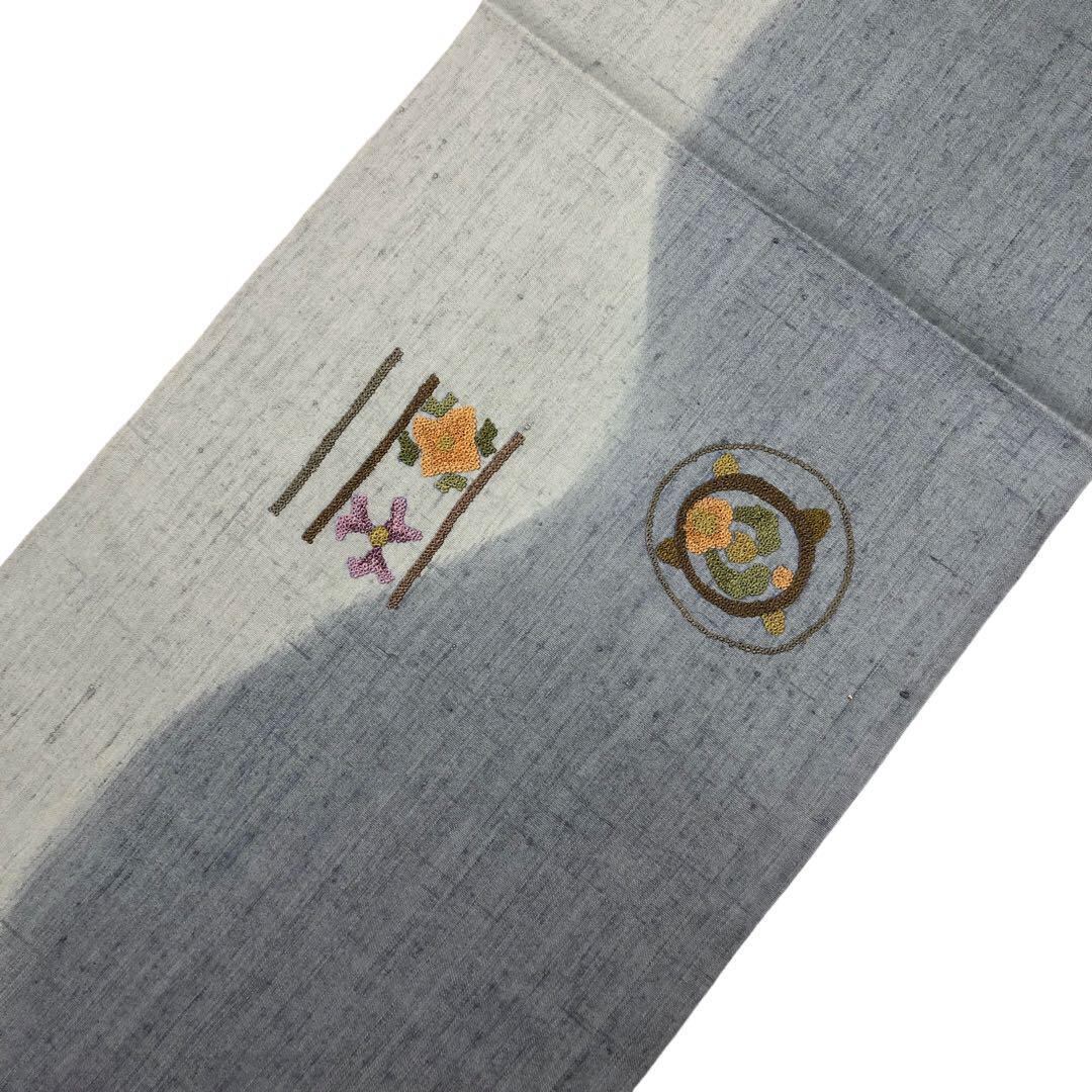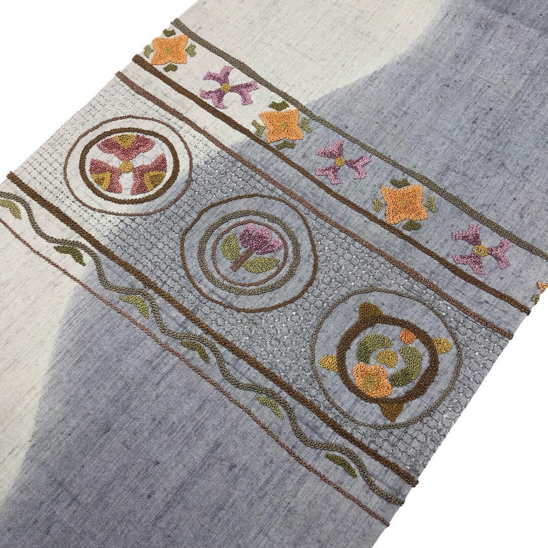 名古屋帯 相良刺繍 汕頭刺繍 花模様 紬 薄鈍色 O-3226