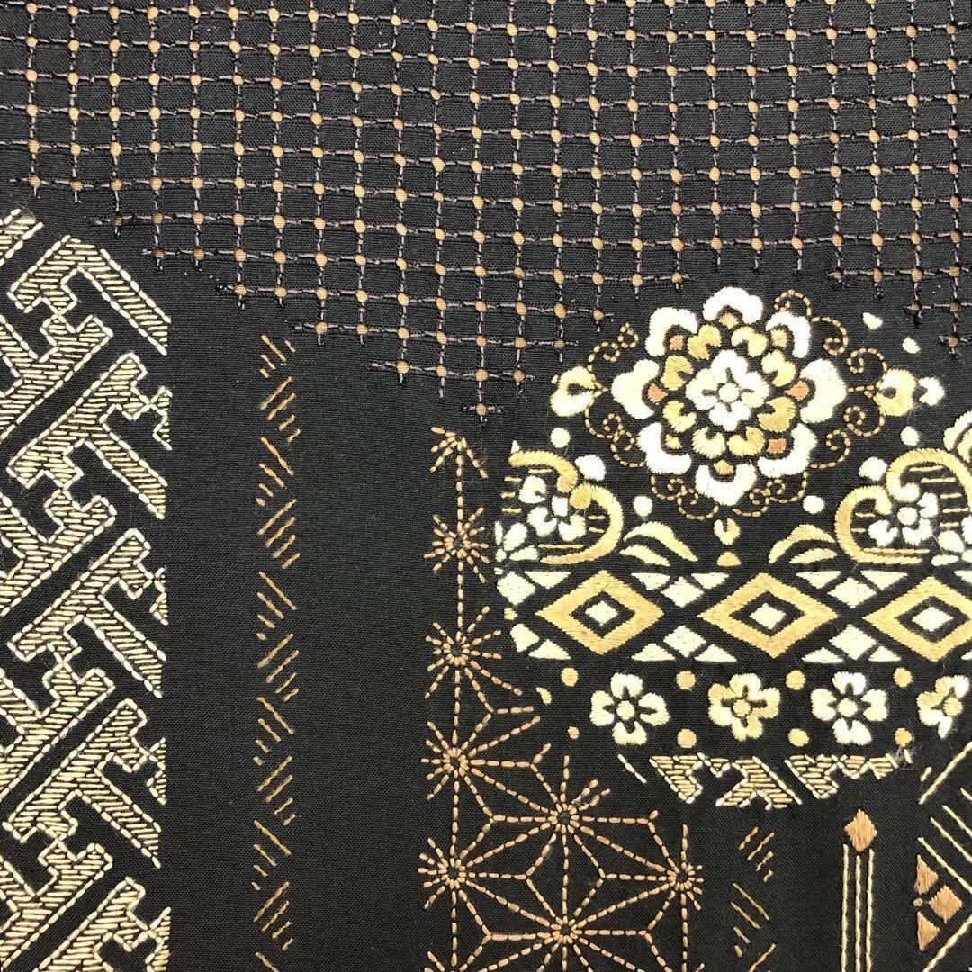 黒地に汕頭刺繍、刺し子、金糸を使った丸に美しい華模様、カラー胴裏も金色に合わせて黒と金色の2色のお色味でモダンにデザインされた総刺繍の極上のお品でございます。