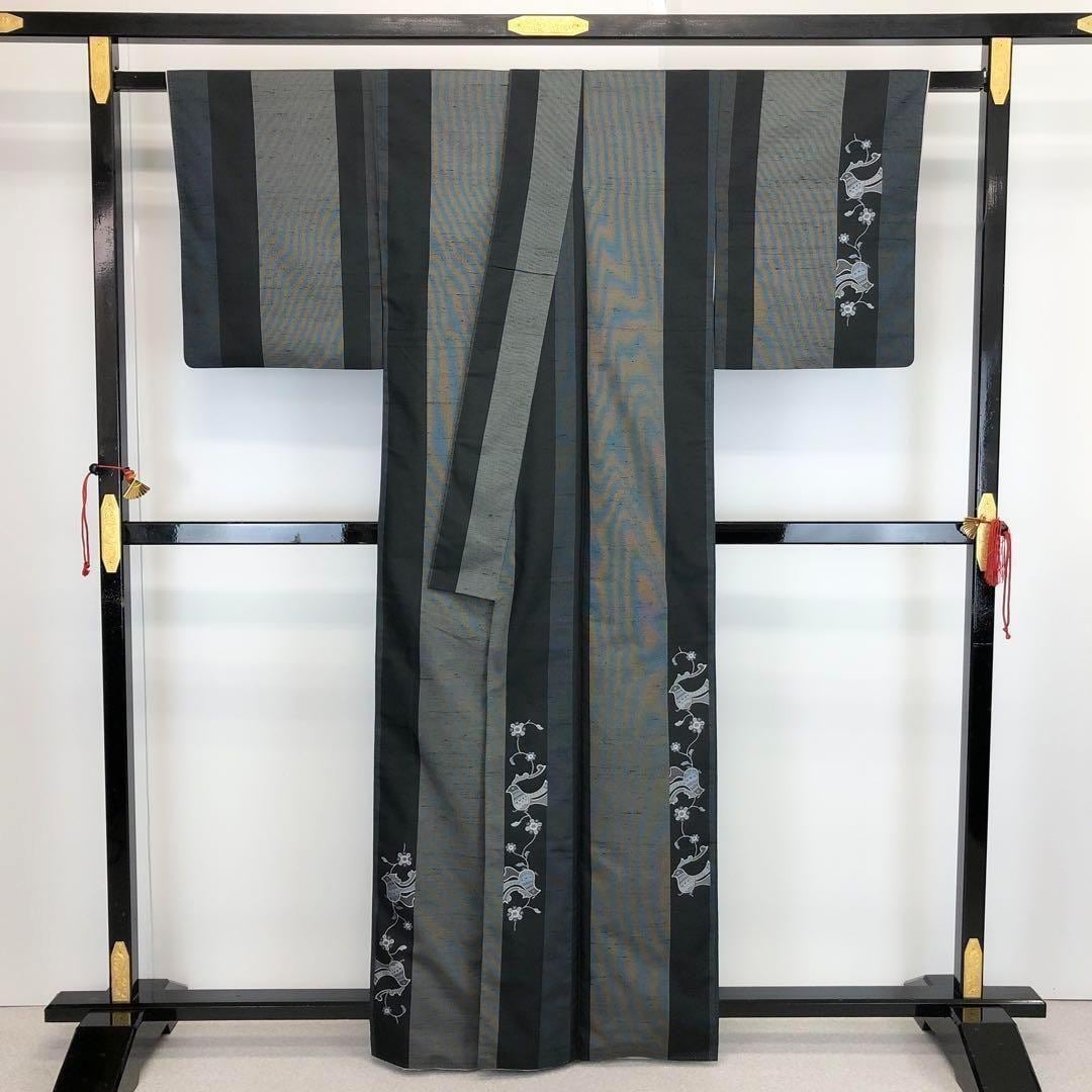 付下げ 紬 縦縞模様 鳥に花模様 モノトーン K-3343 着物 きもの kimono 和服 和装 中古 リサイクル着物 【送料無料】