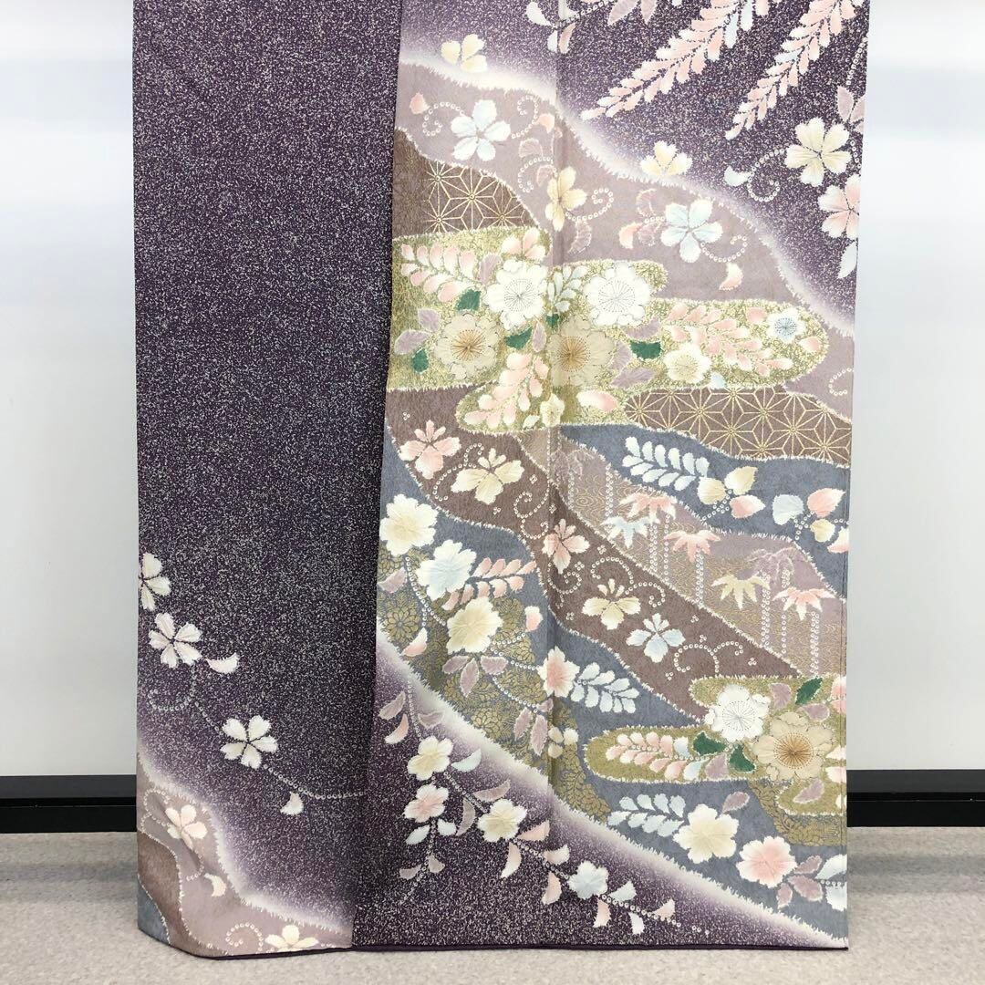 葡萄紫色のお色味に叩き染、金彩、美しい辻が花絞りでデザインされた素敵なお品でございます。