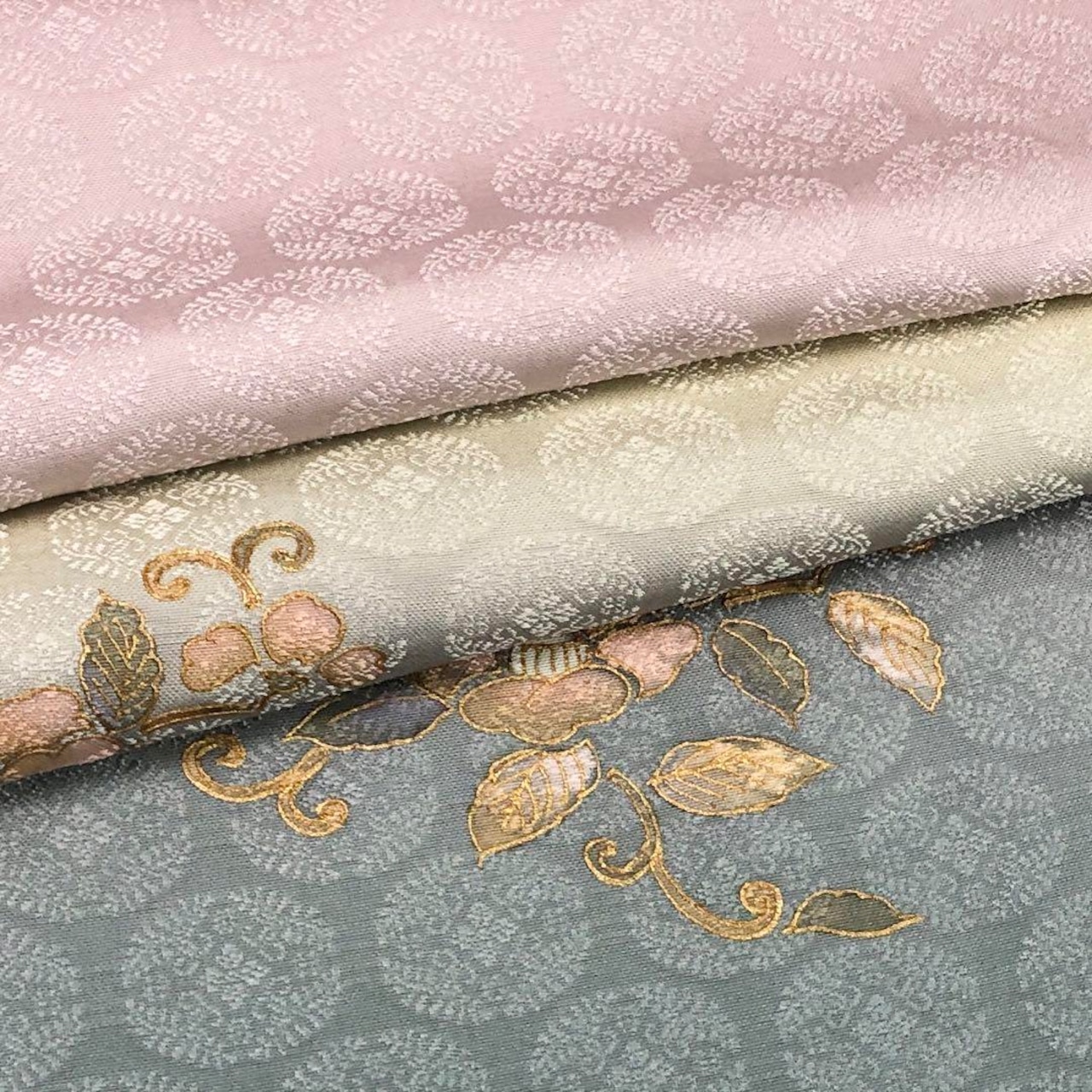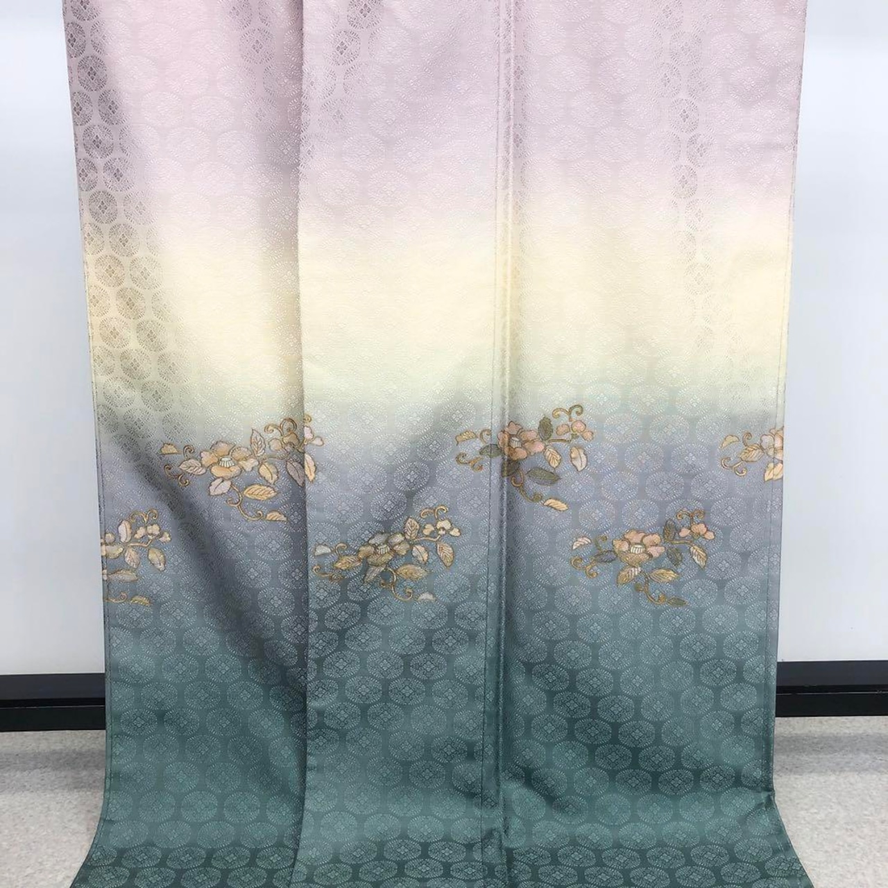 白梅色ベースのパステルカラーのグラデーションに丸に花柄の地模様、椿の花がデザインされた素敵なお品でございます。