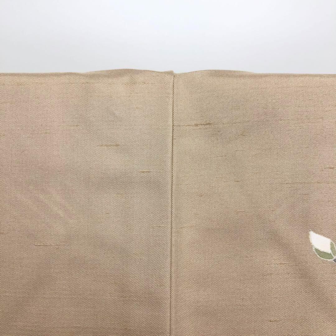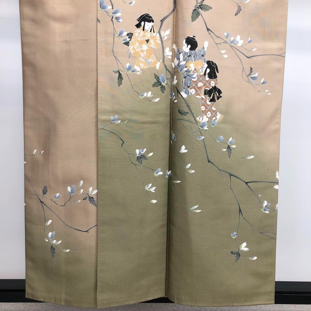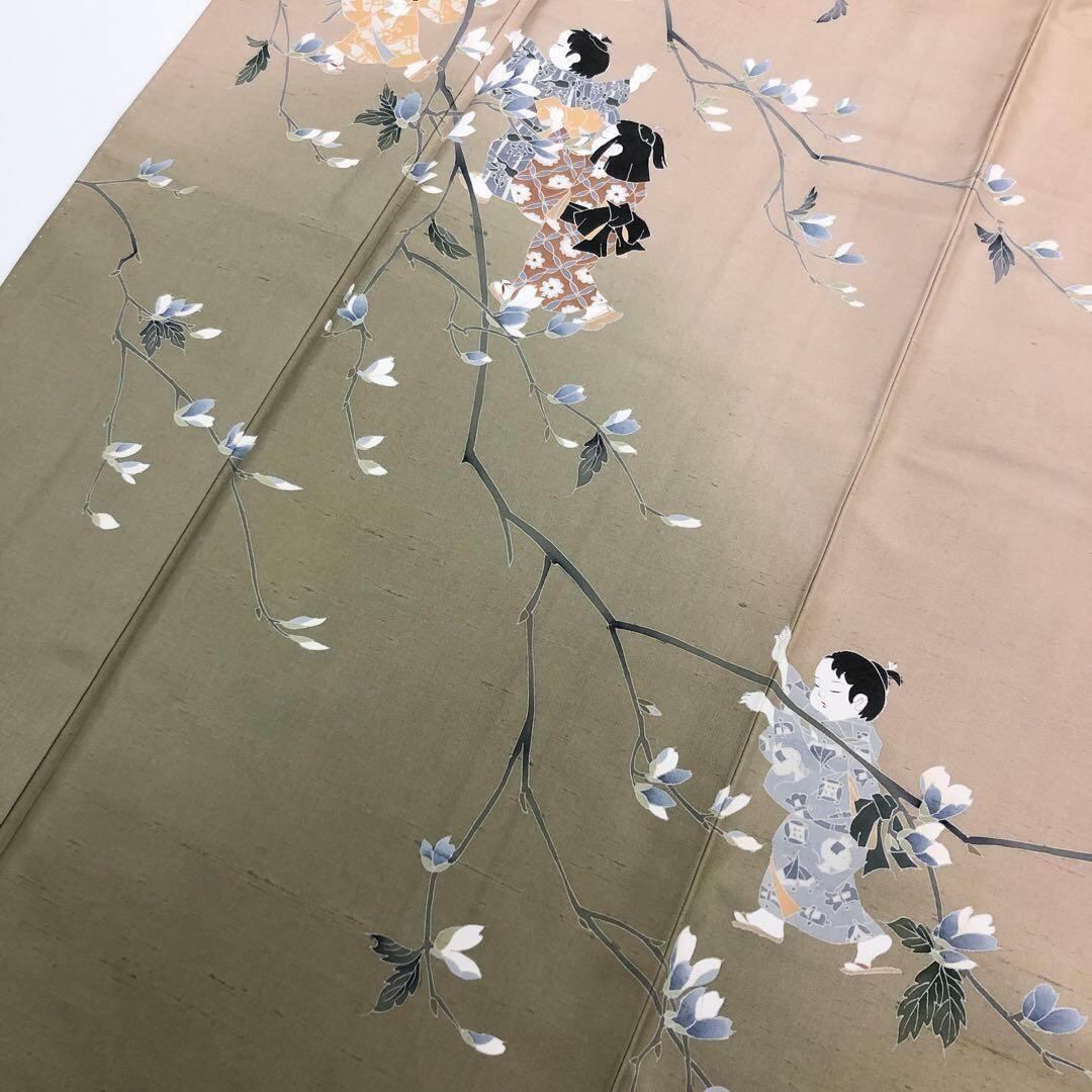 亜麻色の紬地に淡い暈し色、童子に枝花模様がデザインされた素敵なお品でございます。
