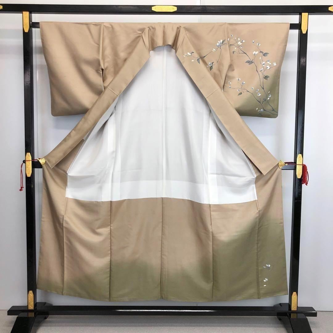 訪問着 紬 友禅 童子に枝花模様 暈し 亜麻色 K-3349 着物 きもの kimono 和服 和装 中古 リサイクル着物 【送料無料】