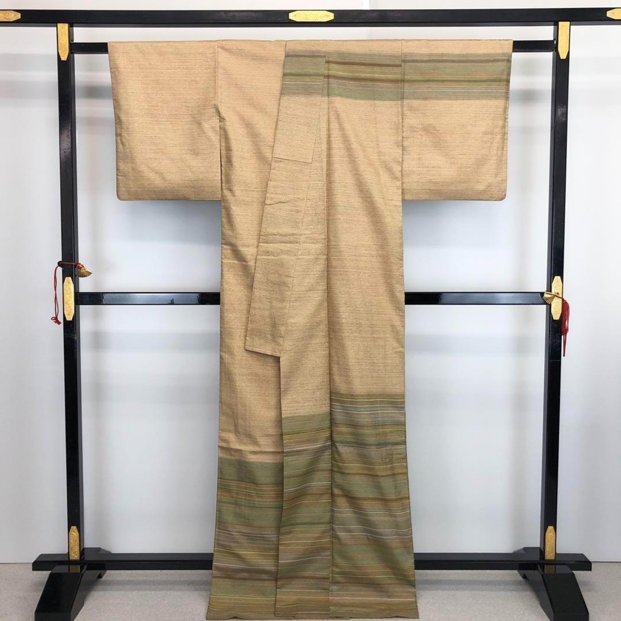 密陀僧色ベースに落ち着きのある色彩でデザインされた横縞模様が素敵な柄裄のお品でございます。