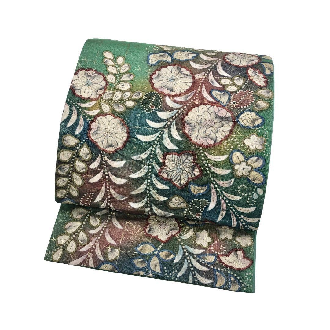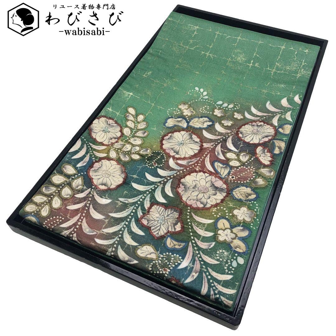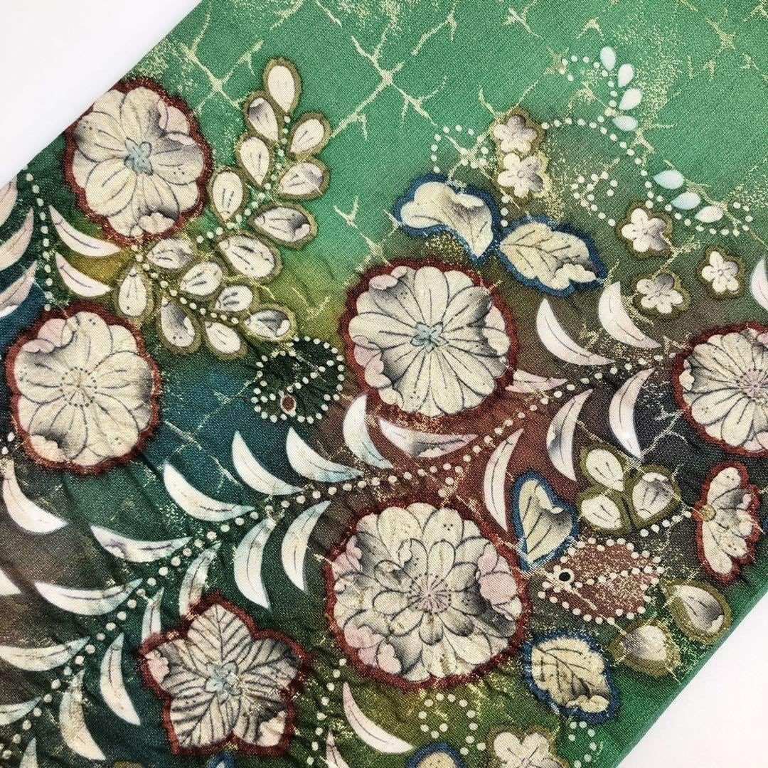 草緑色に金通し、格子模様に美しい辻が花模様がデザインされた素敵なお品でございます。