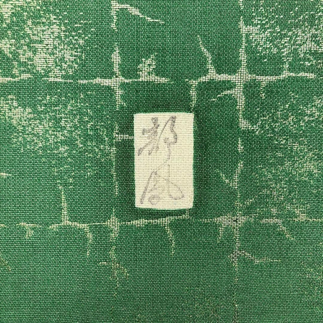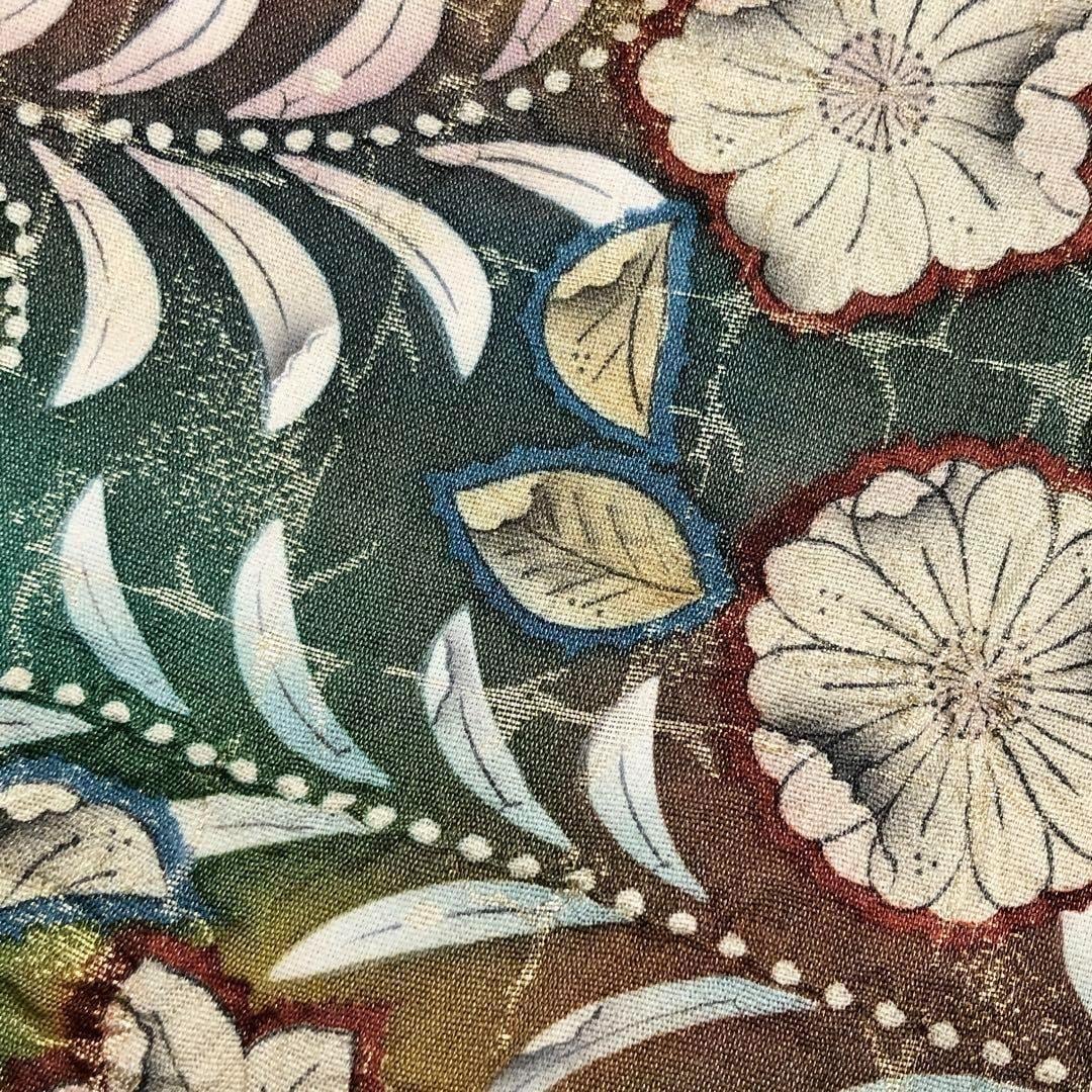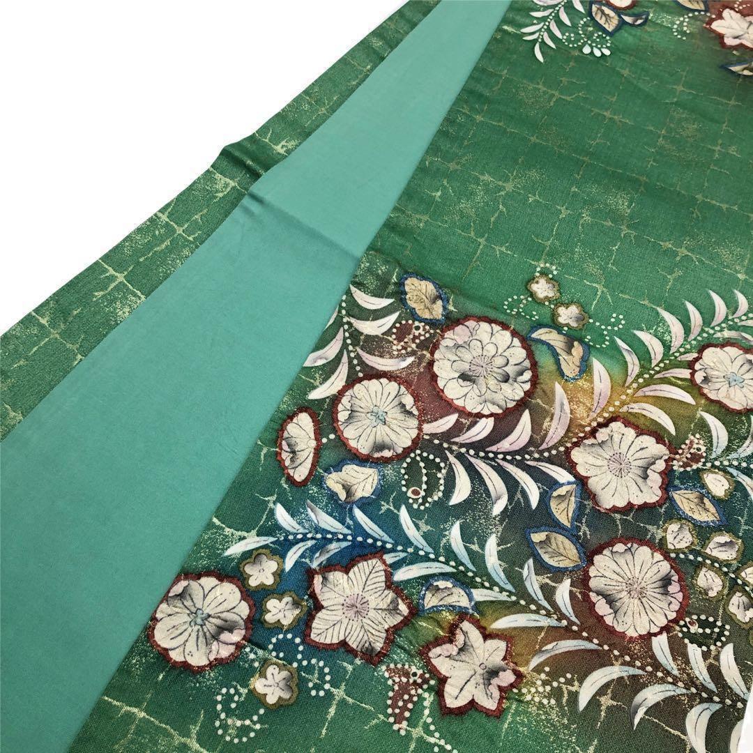 草緑色に金通し、格子模様に美しい辻が花模様がデザインされた素敵なお品でございます。