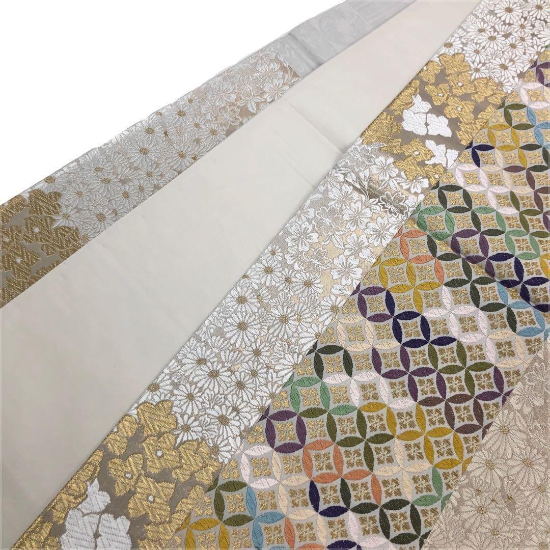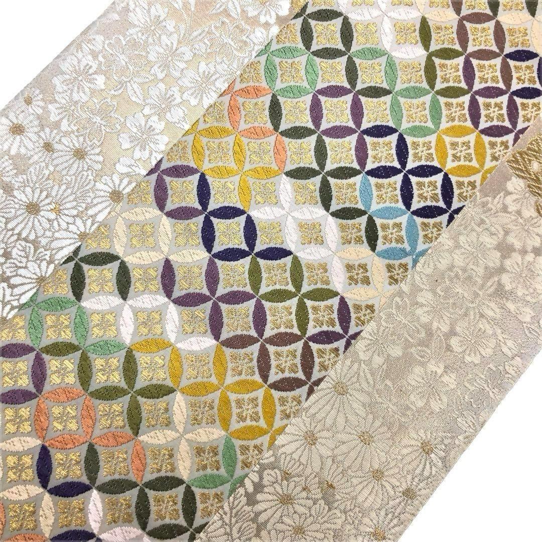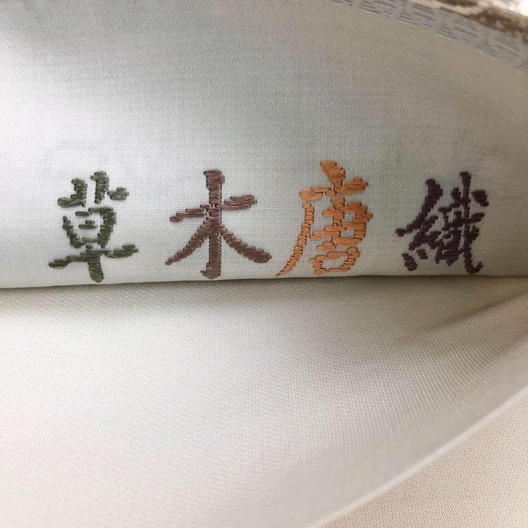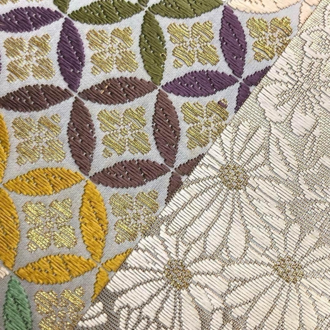草木唐織、吉祥百寿文と題された縦柄の金糸を使った鮮やかな七宝繋ぎに菊や桜の四季の花模様がデザインされた素敵な柄裄のお品でございます。