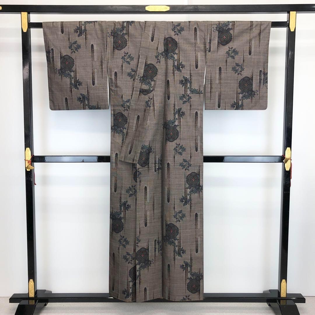 茶泥染の風合いの良いお色味に縦柄の霞模様に丸花柄がデザインされた素敵なお品でございます。