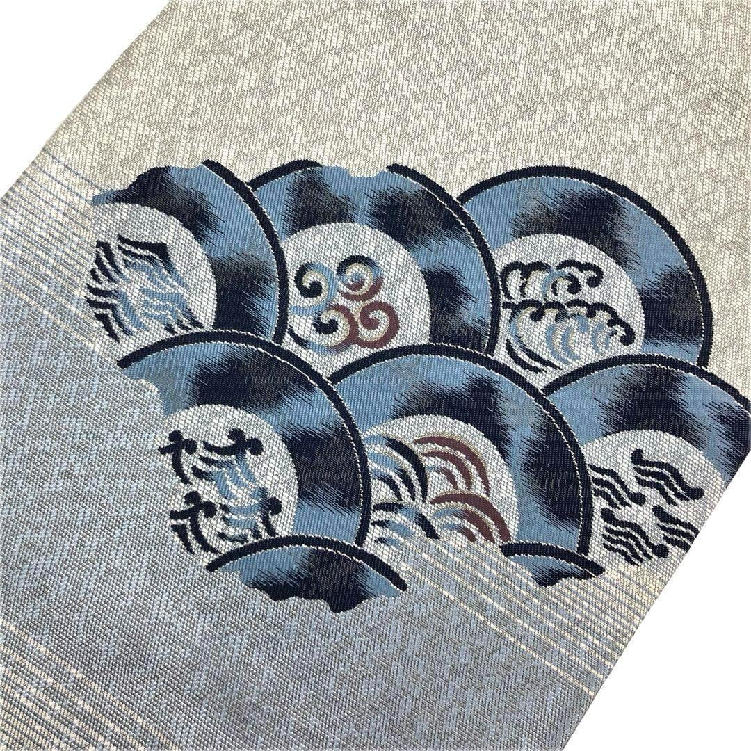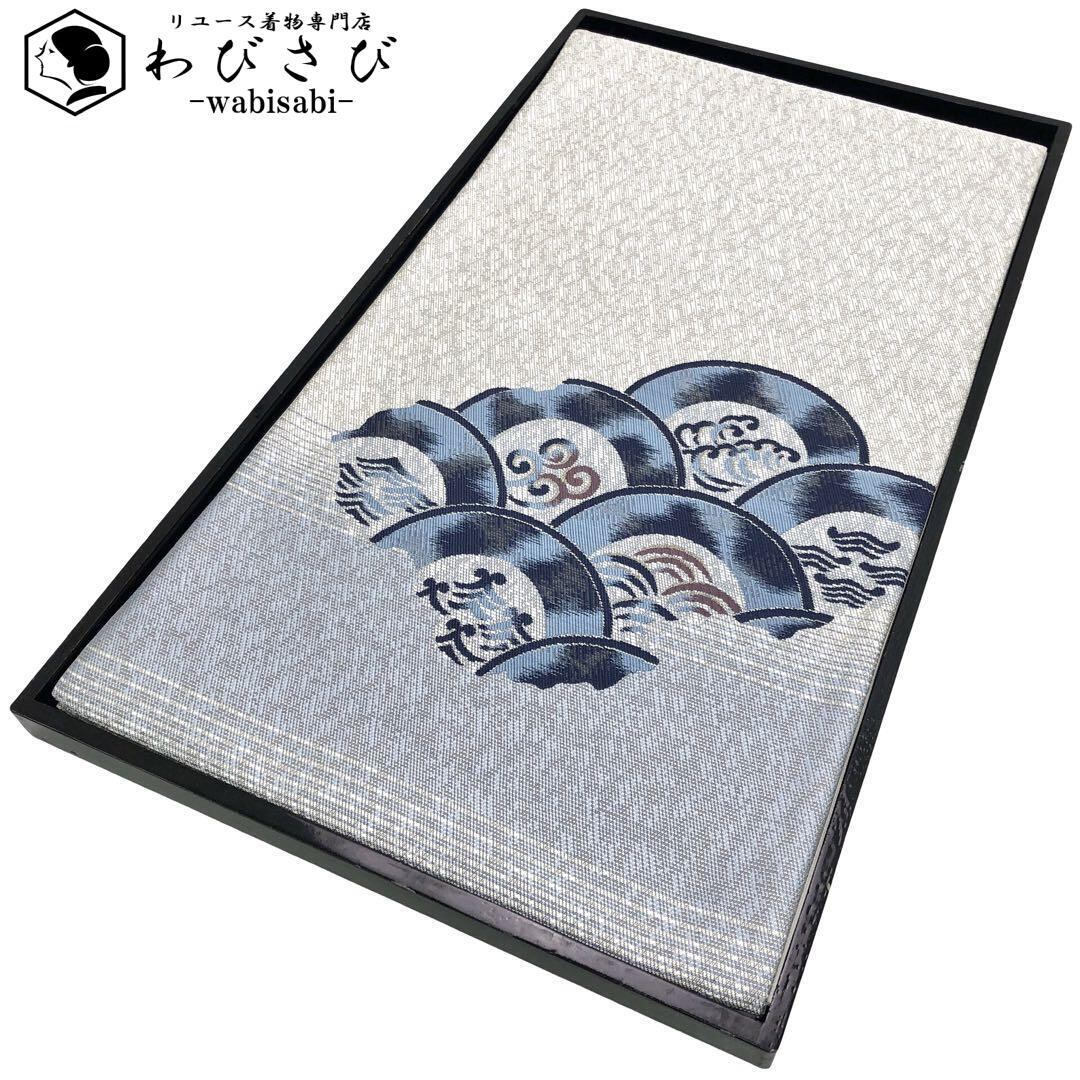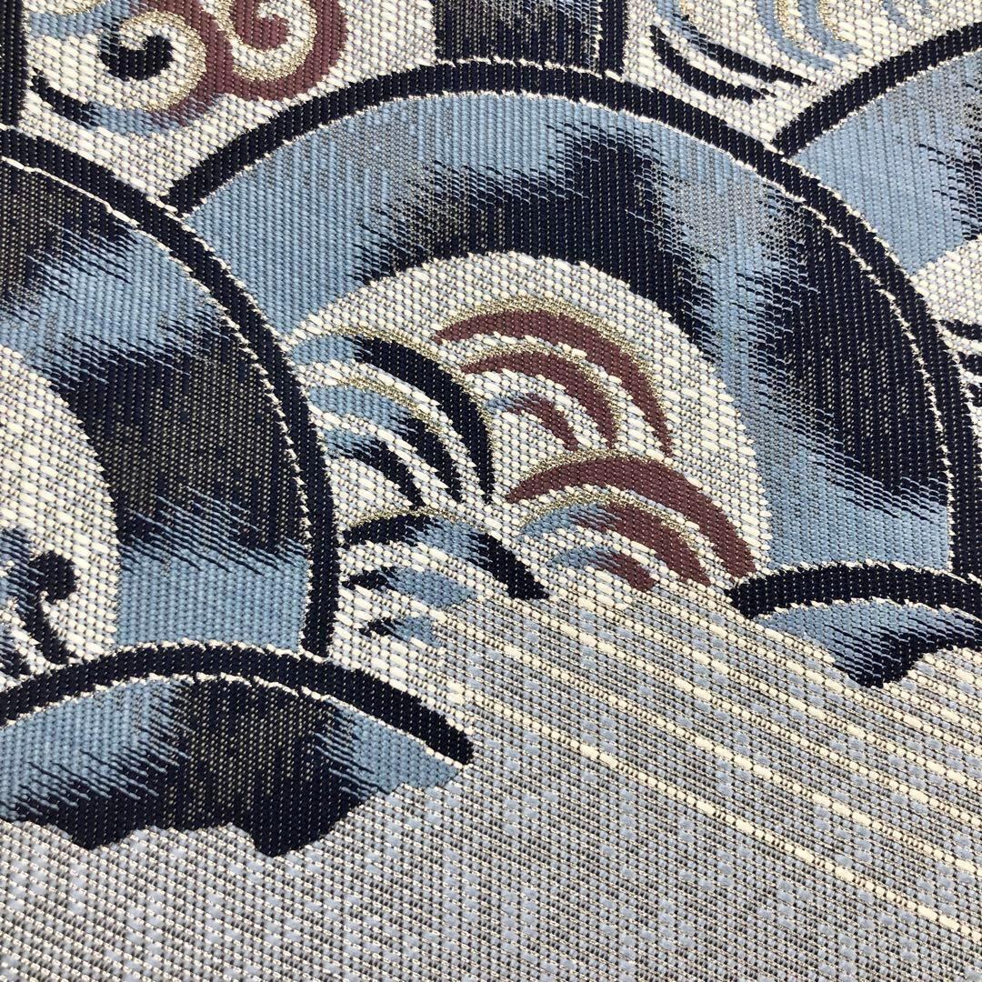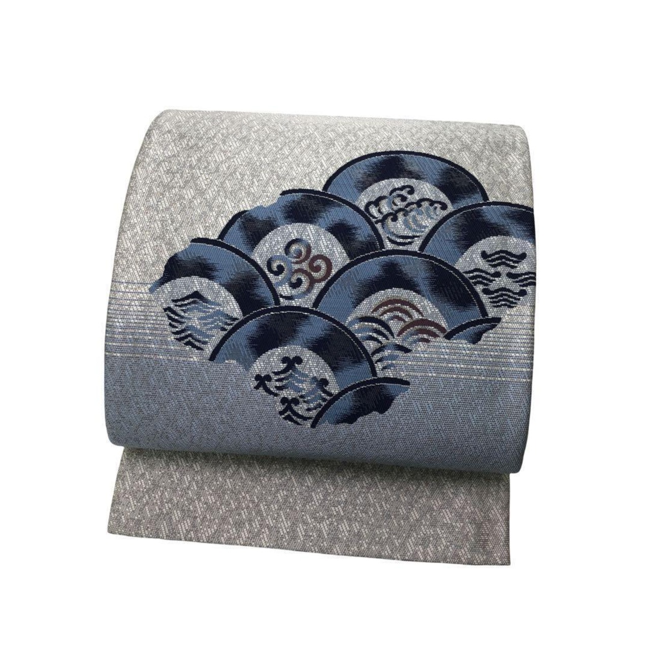 乳白色ベースの品のあるお色味に地模様、藍染でデザインされた青海波の柄の中に多様な波の柄がデザインされた楽しさと品の感じられる素敵なお品でございます。