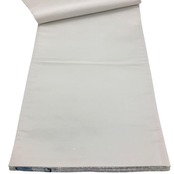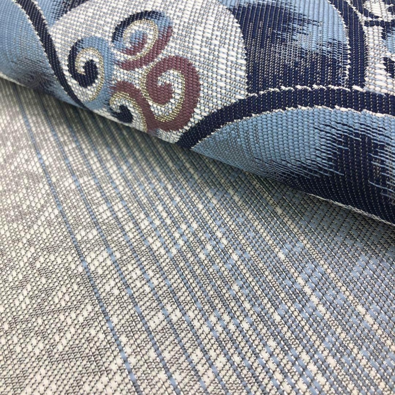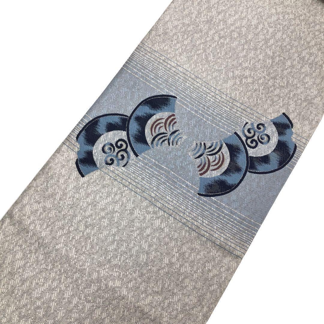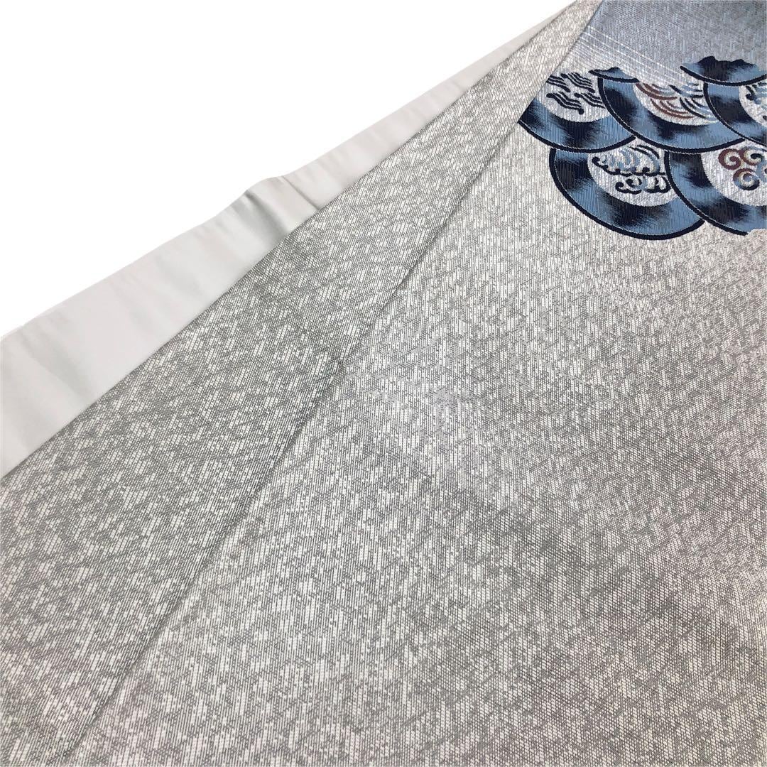 乳白色ベースの品のあるお色味に地模様、藍染でデザインされた青海波の柄の中に多様な波の柄がデザインされた楽しさと品の感じられる素敵なお品でございます。