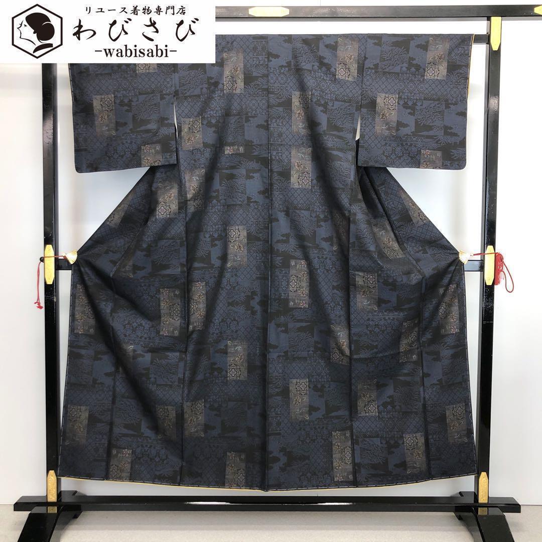 藍泥染のお色味に四角に花模様の柄裄がデザインされた素敵なお品でございます。