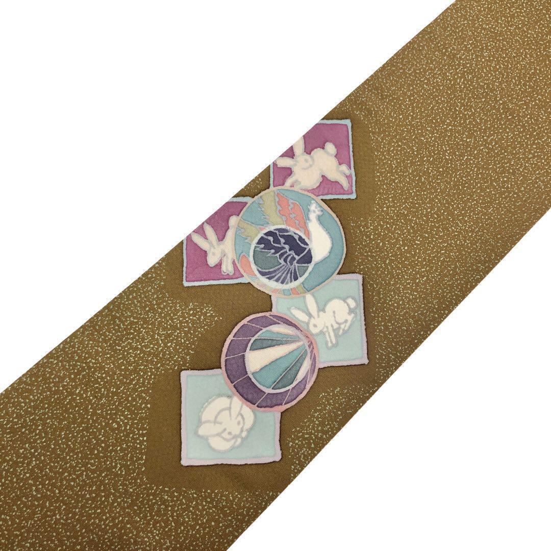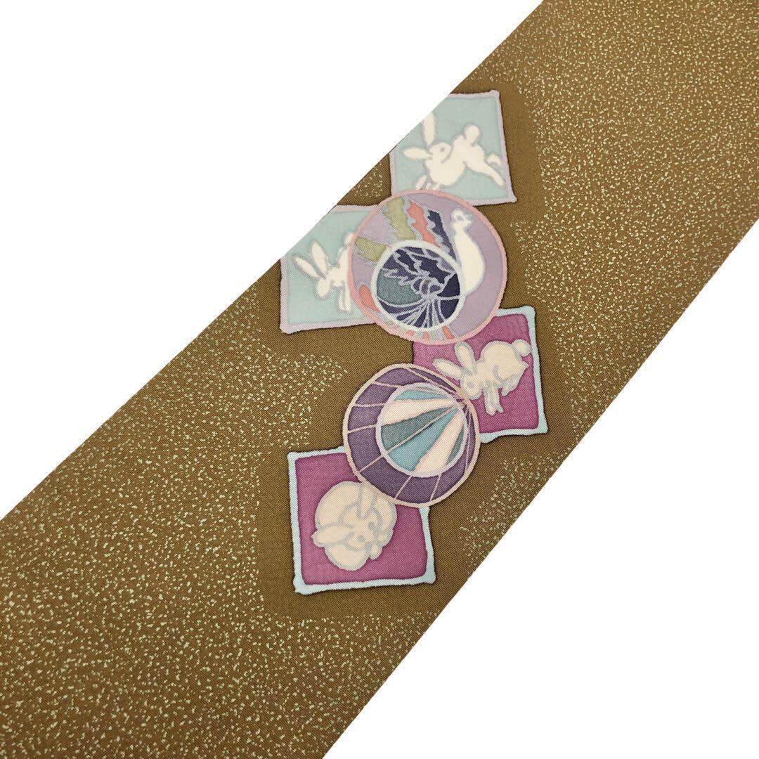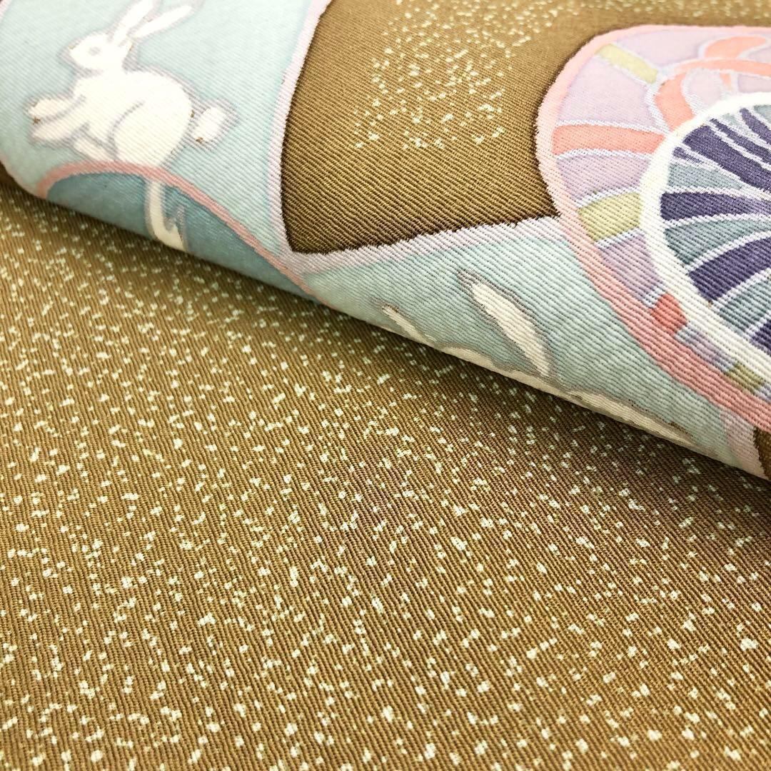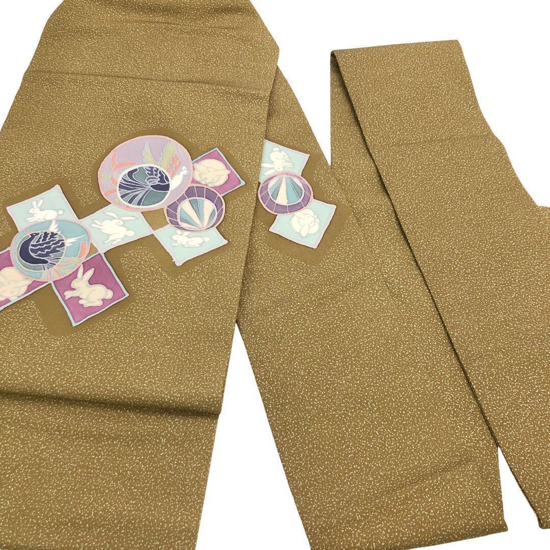 路考茶色の落ち着きのある塩瀬に叩き染、四角にこわいいうさぎの柄裄がデザインされた素敵なお品でございます。