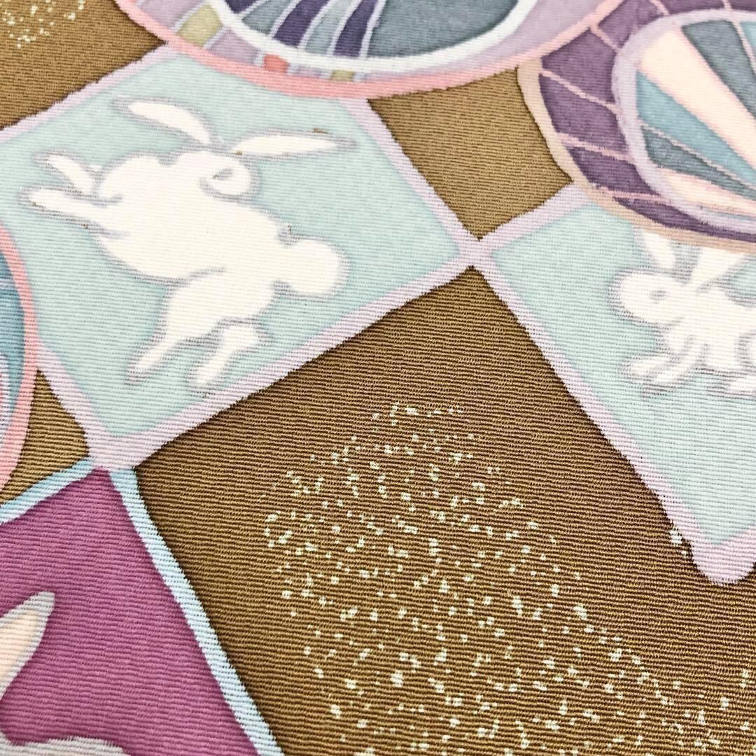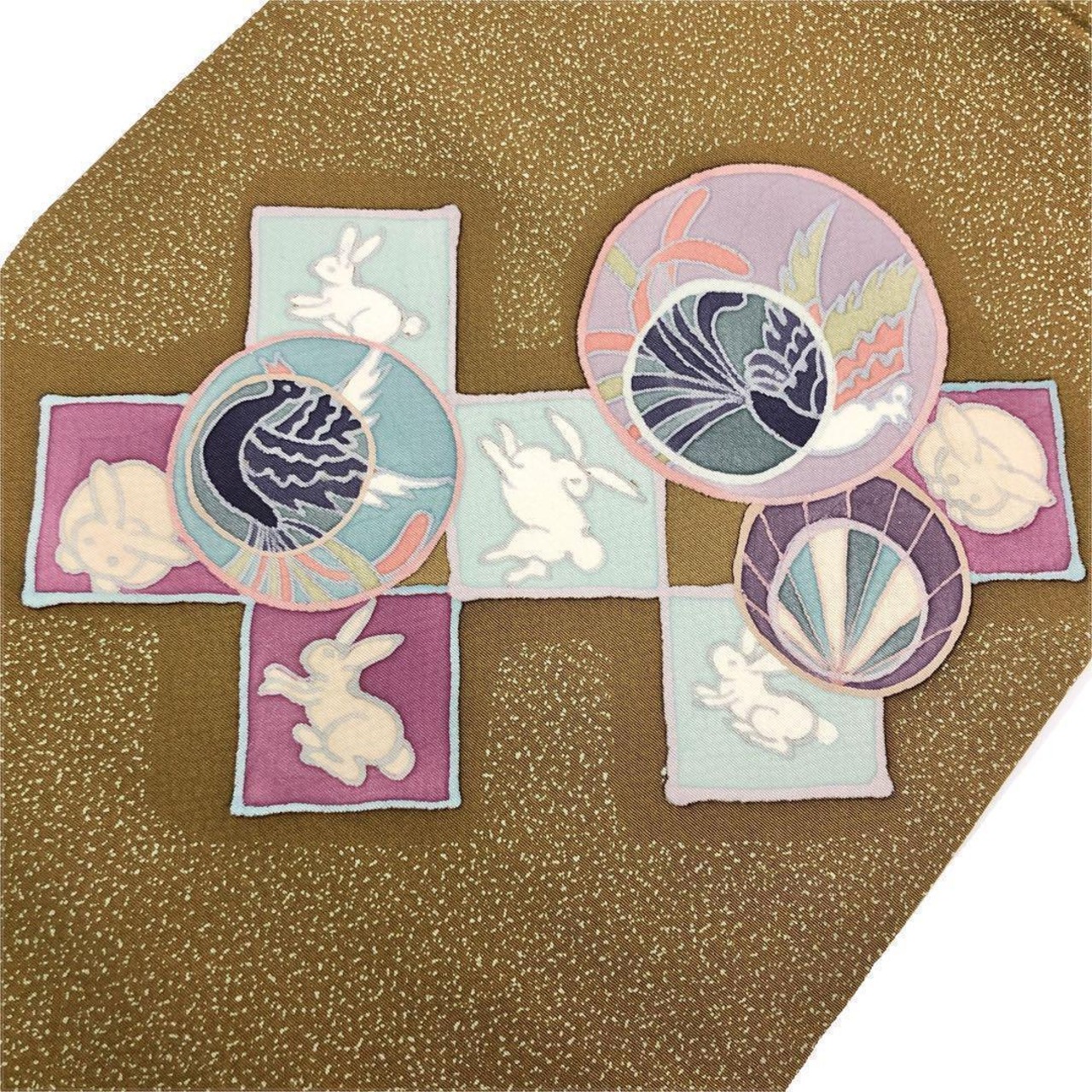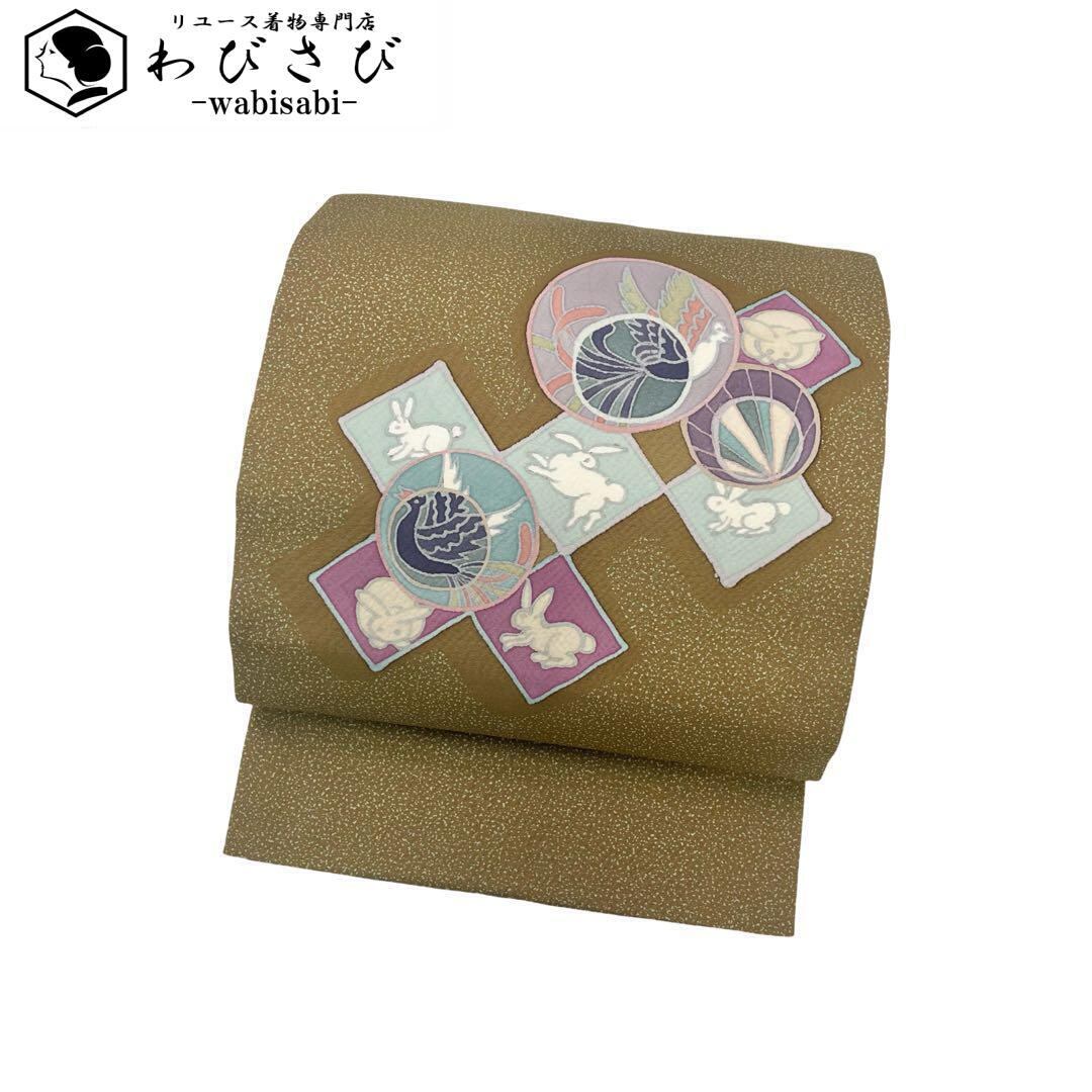 路考茶色の落ち着きのある塩瀬に叩き染、四角にこわいいうさぎの柄裄がデザインされた素敵なお品でございます。
