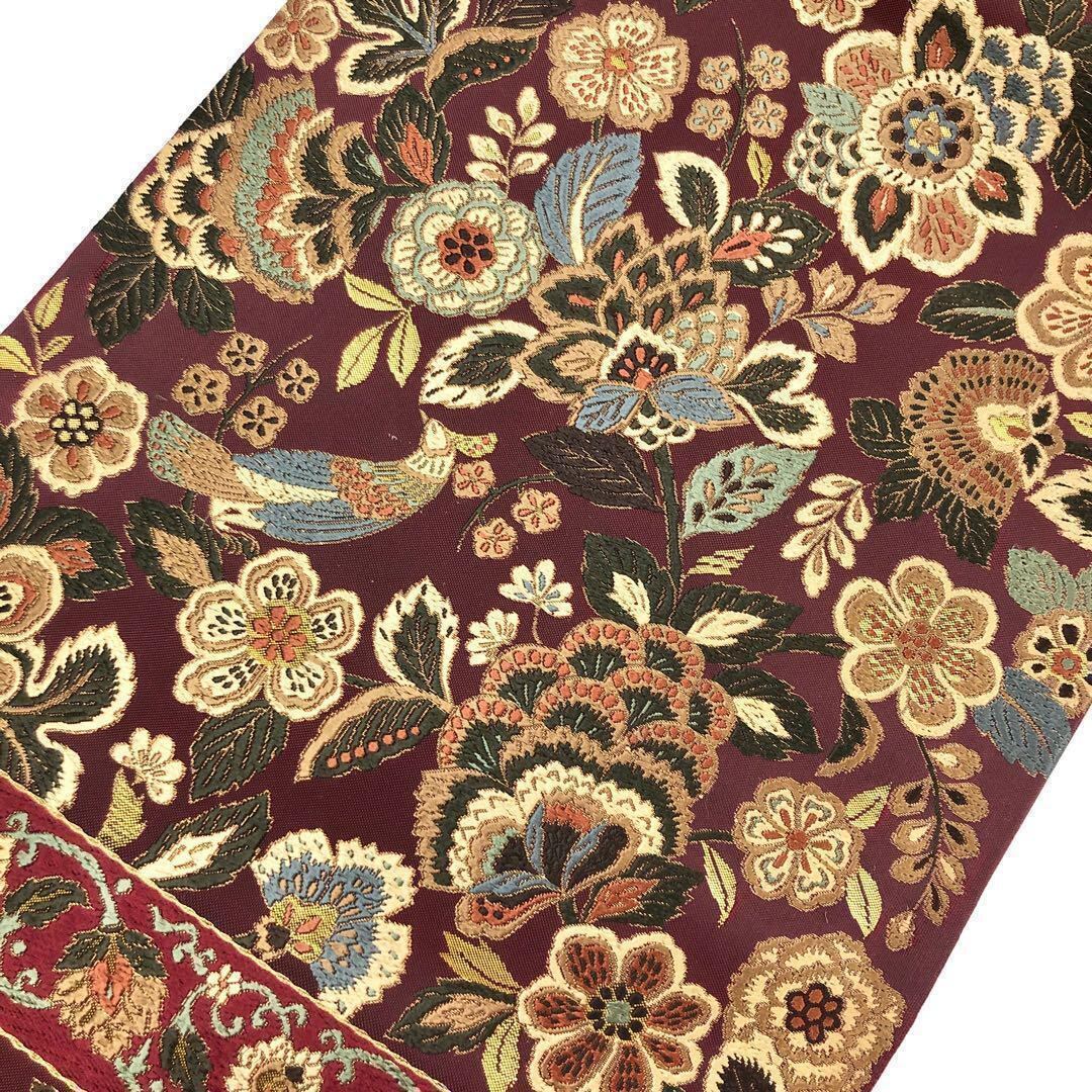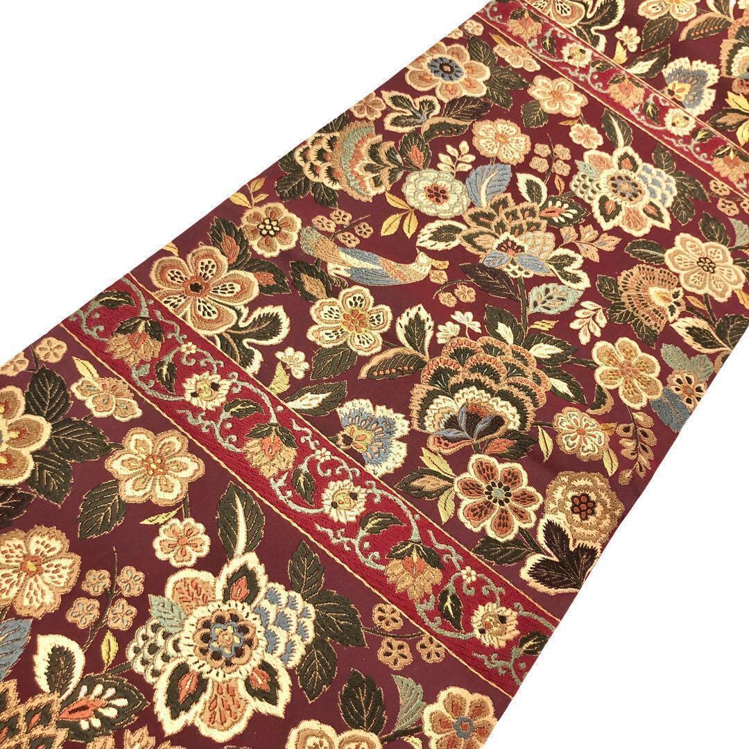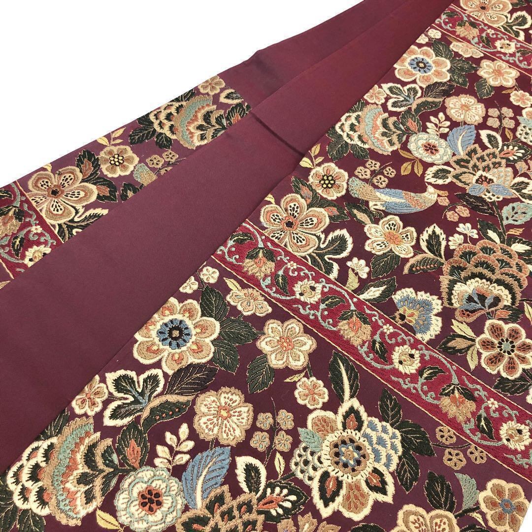 段華粋更紗文と題された赤紫色の高級感のあるお色味に美しい花唐草に鳥柄がデザインされた妖艶な雰囲気の素敵なお品でございます。