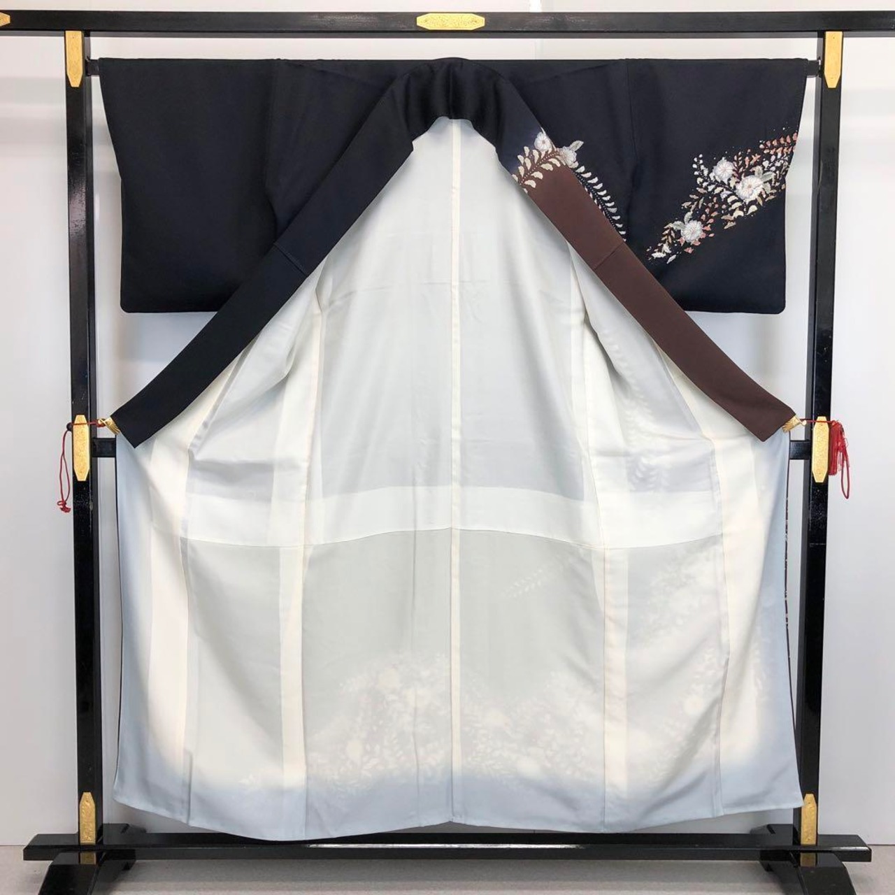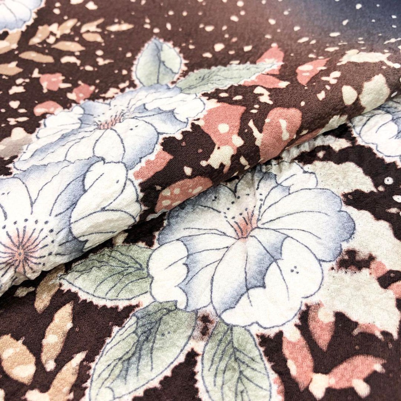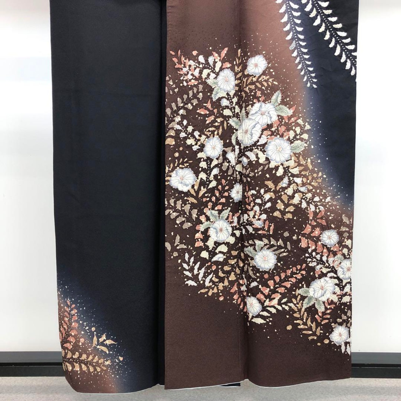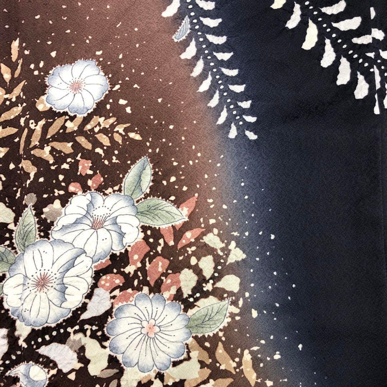 青褐色の落ち着いたお色味の縮緬地に暈し、美しい辻が花絞りの柄裄がデザインされた素敵なお品でございます。