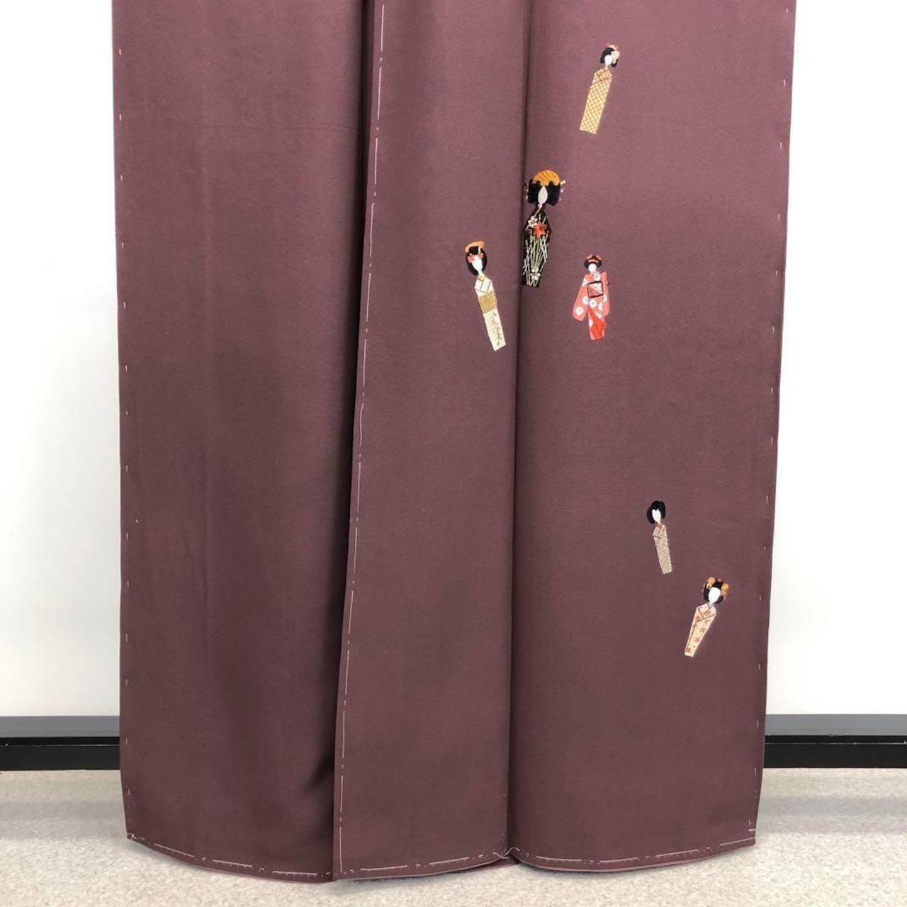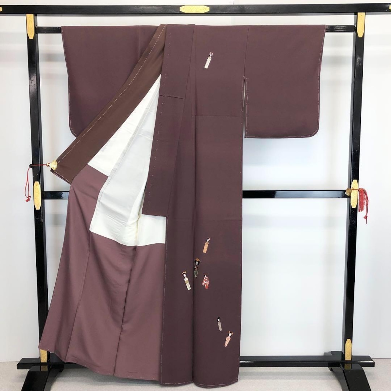付下げ 刺繍の女性こけし柄 丹後縮緬 重ね衿 紫鳶色 ガード加工 K-3373