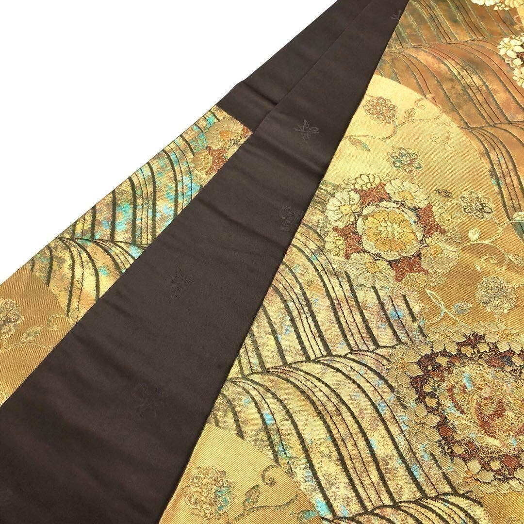黄金色ベースの煌びやかなお色味、暈しのような引き箔、華模様、花唐草、波模様などがデザインされた上品な柄裄の素敵なお品でございます。