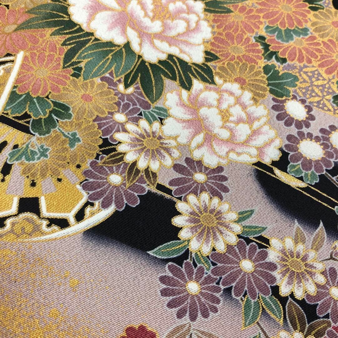 煌びやかで美しい金彩友、霞模様に四季の花々に花車、松などの華やかな柄裄がデザインされた品のある素敵な柄裄のお品でございます。