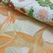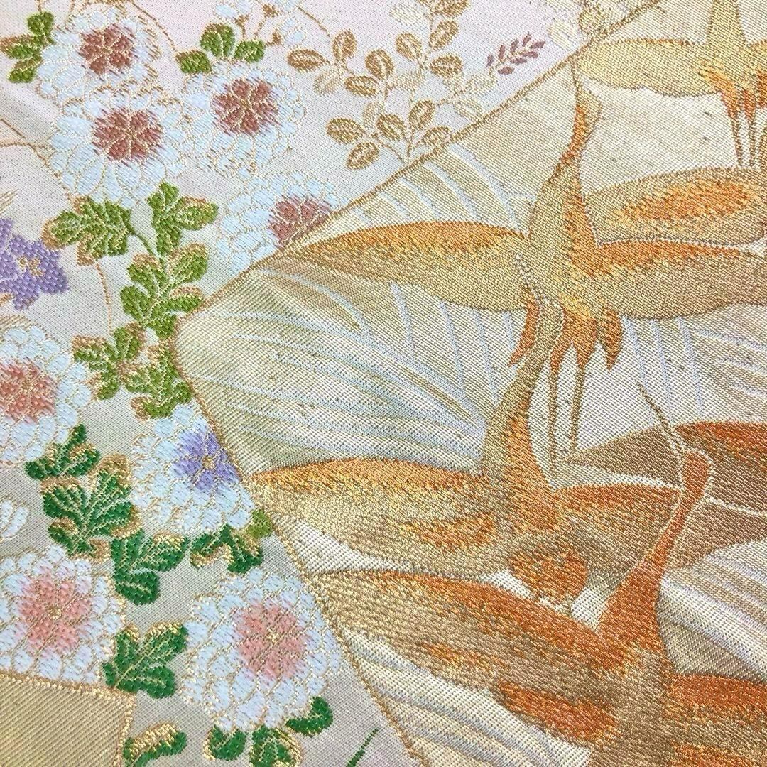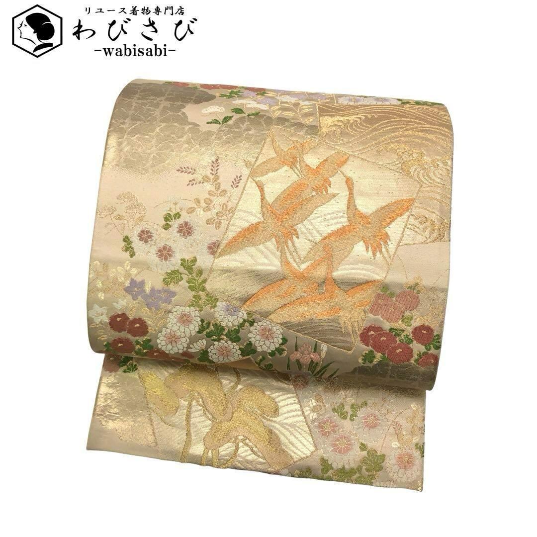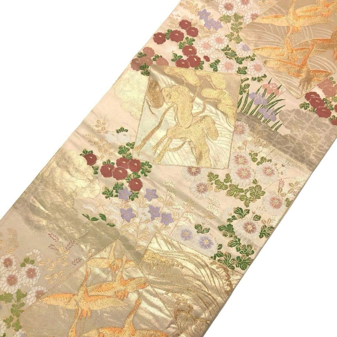 金色ベースのお色味に格子模様、飛翔鶴に美しい四季の花模様、松、波模様などがデザインされた煌びやかで素敵な柄裄のお品でございます。