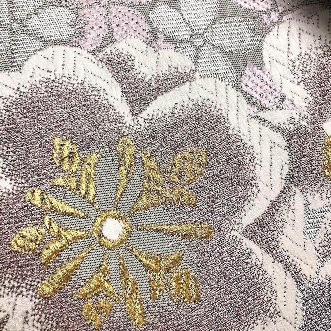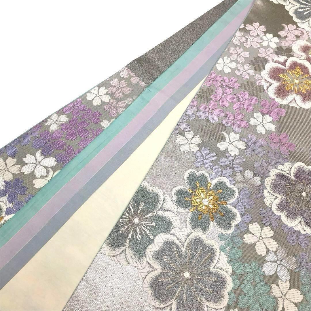 銀色ベースのお色味にパステル色の暈し、金銀糸を使った煌びやかで美しい桜の花模様がデザインされた柔らかめで変わり結びもし易い可愛いさのある素敵なお品でございます。