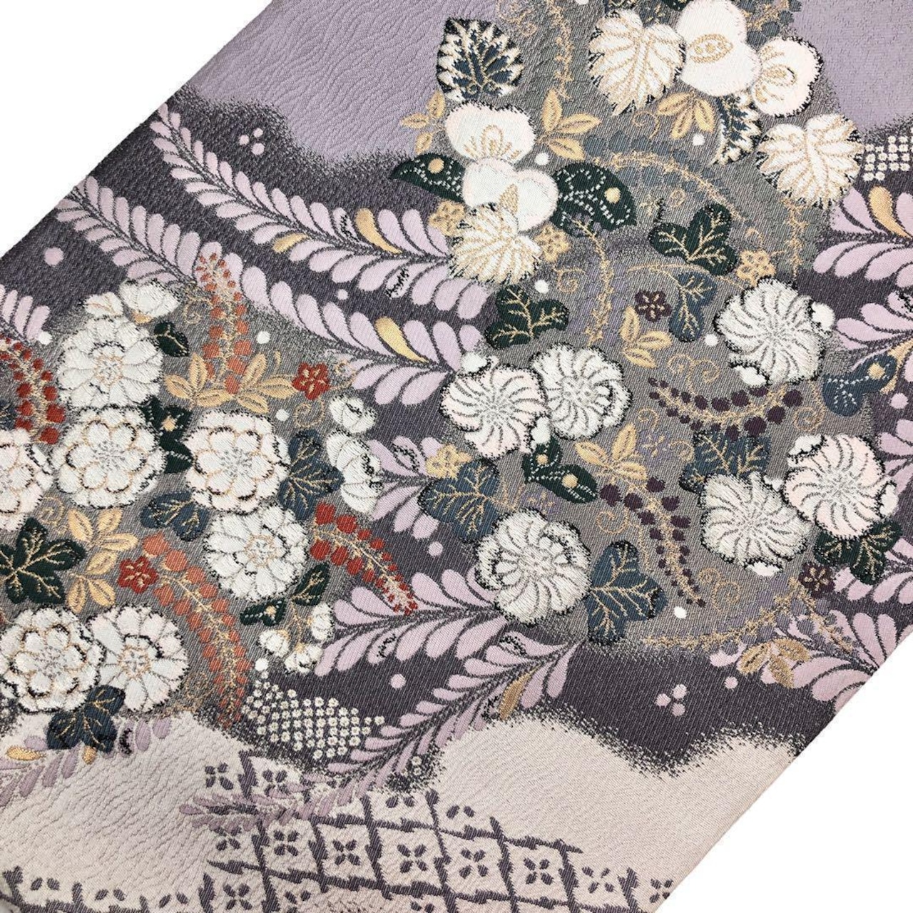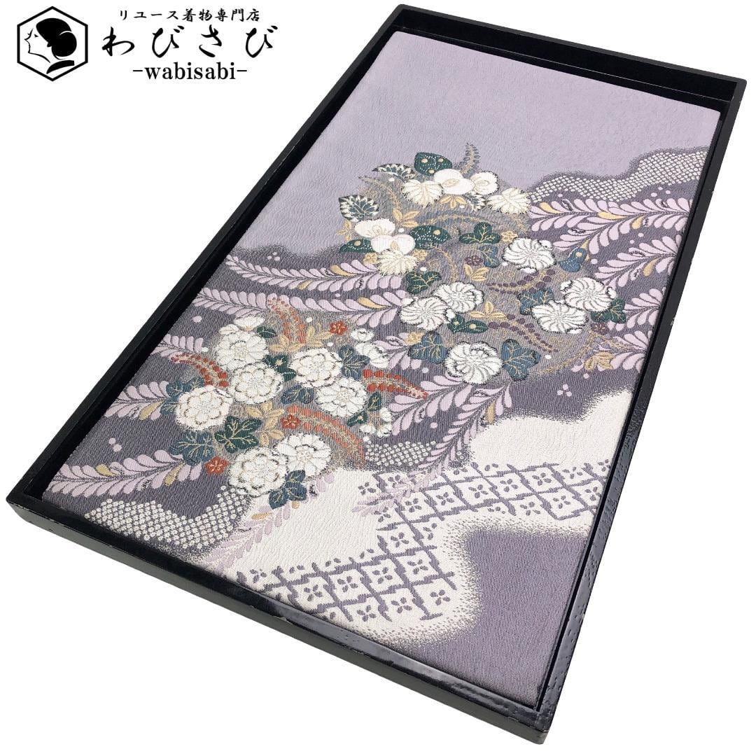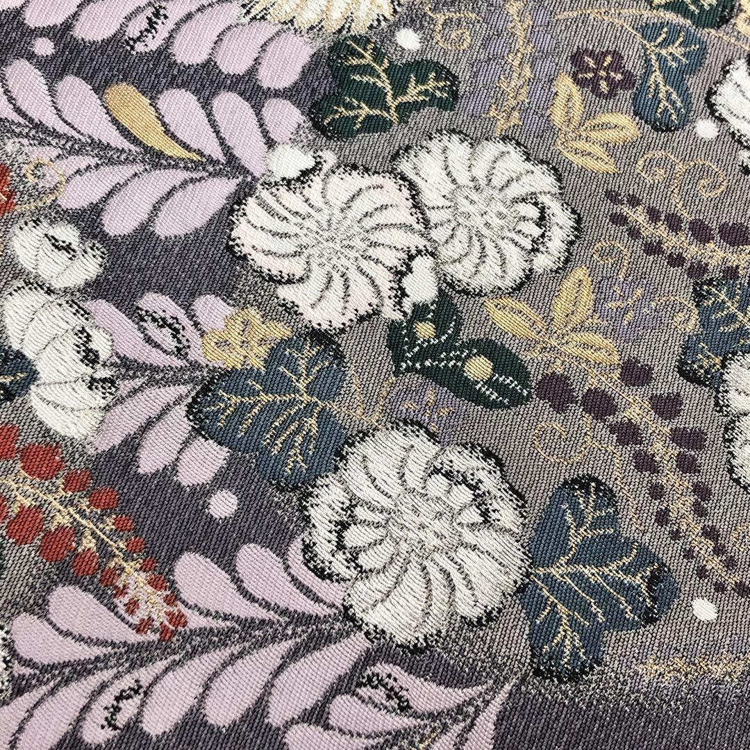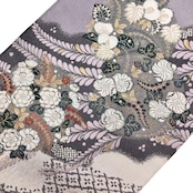 浅滅紫色ベースのお色味、さり気なく金銀糸を使った流水に辻が花柄の織模様がデザインされた素敵な柄裄のお品でございます。