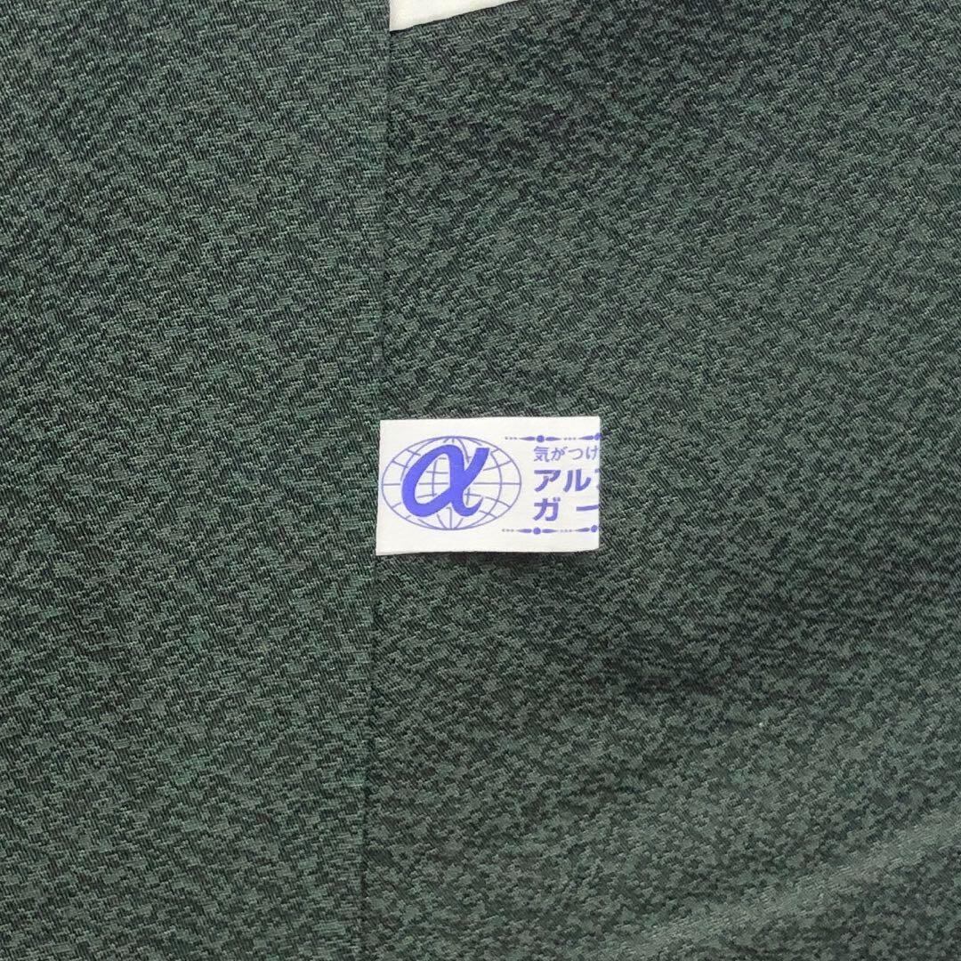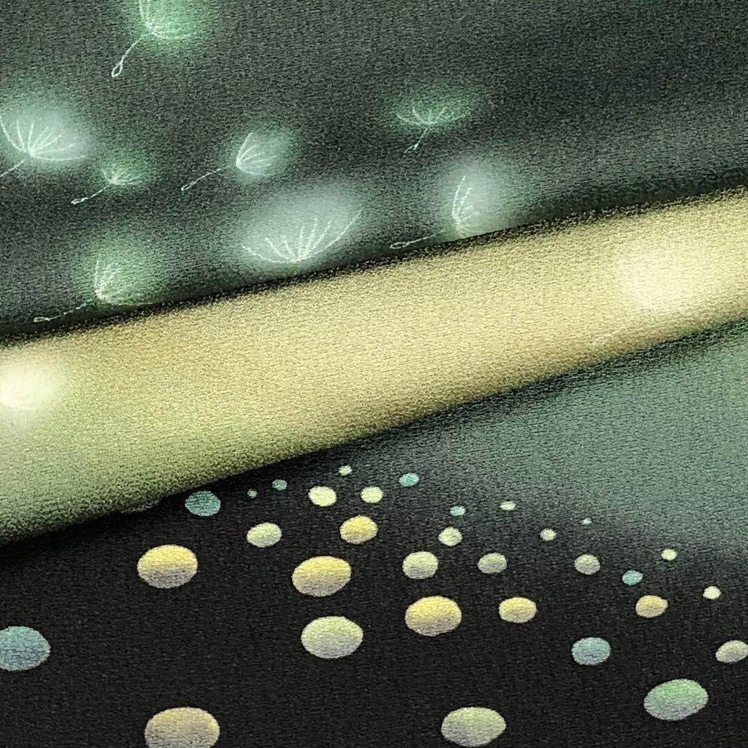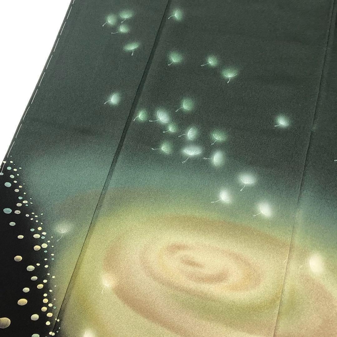 錆鉄色の手触りの良い縮緬に宇宙のような渦模様に水玉、綿毛がデザインされたなんとも幻想的で美しい素敵な柄裄のお品でございます。