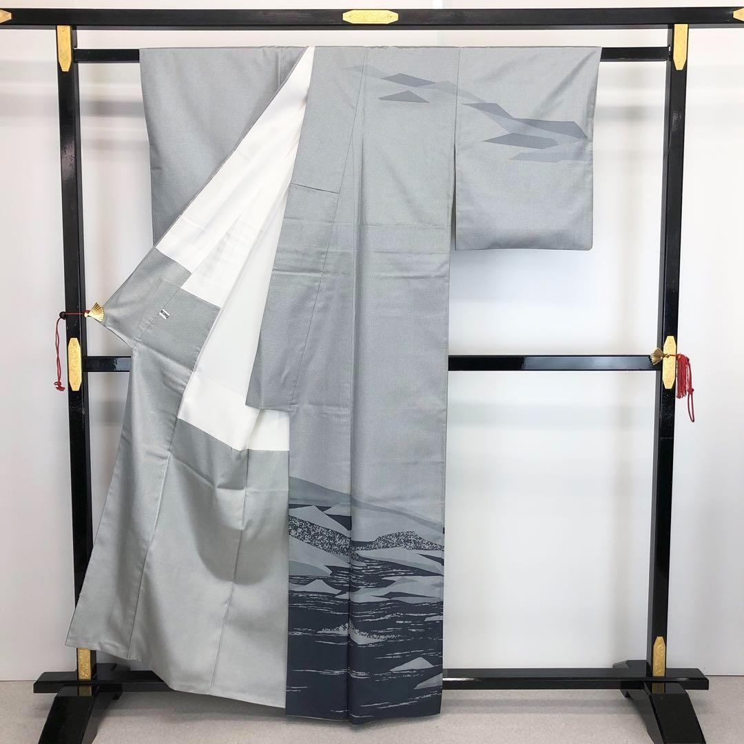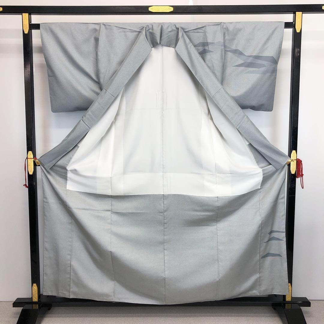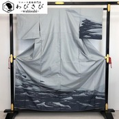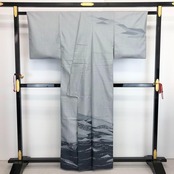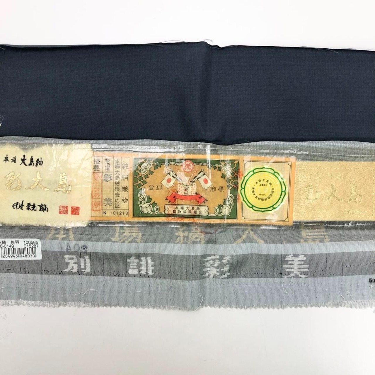 水銀色ベースのお色味に落ち着いある藍系のお色で染め上げられた彩大島と題された美しい柄裄のお品でございます。
