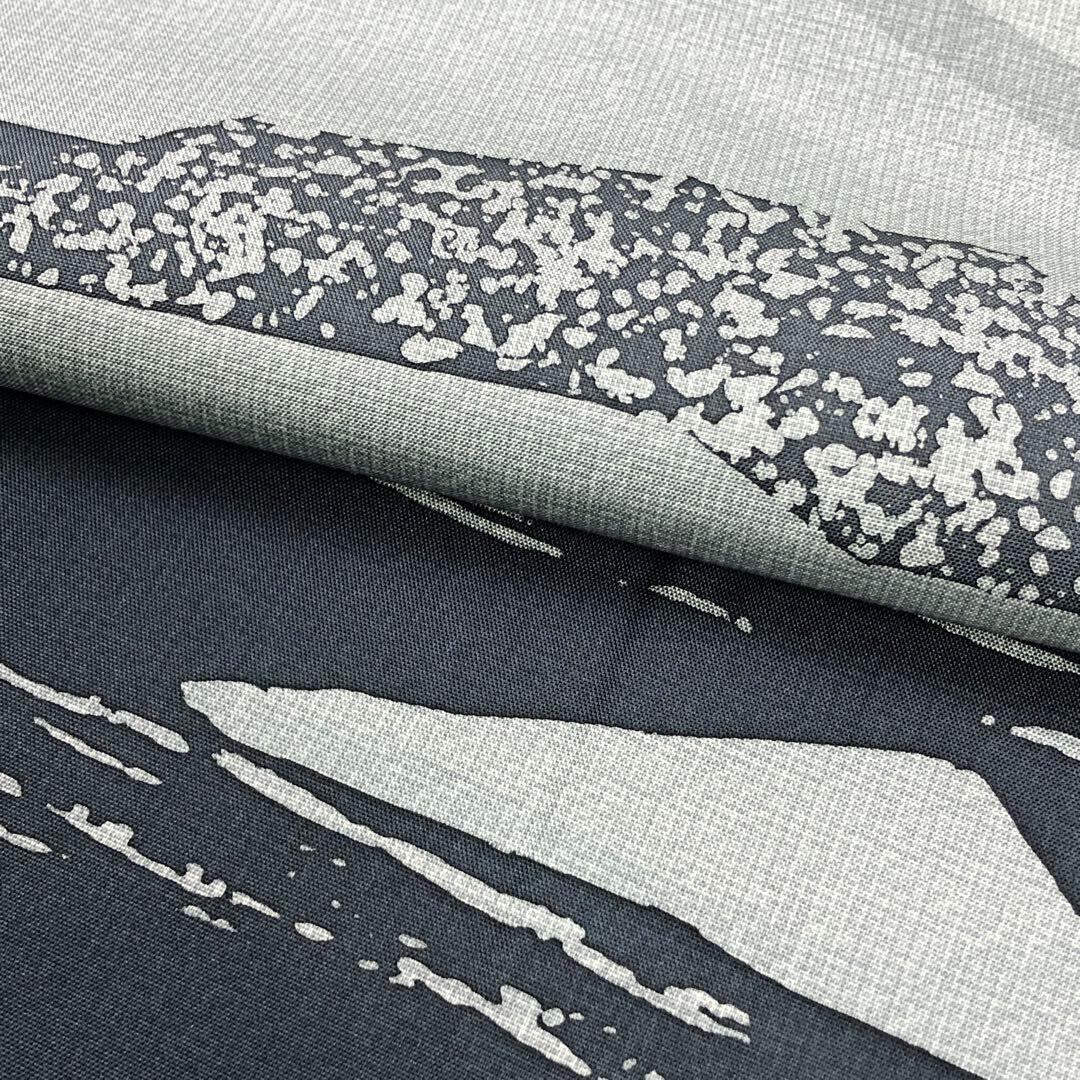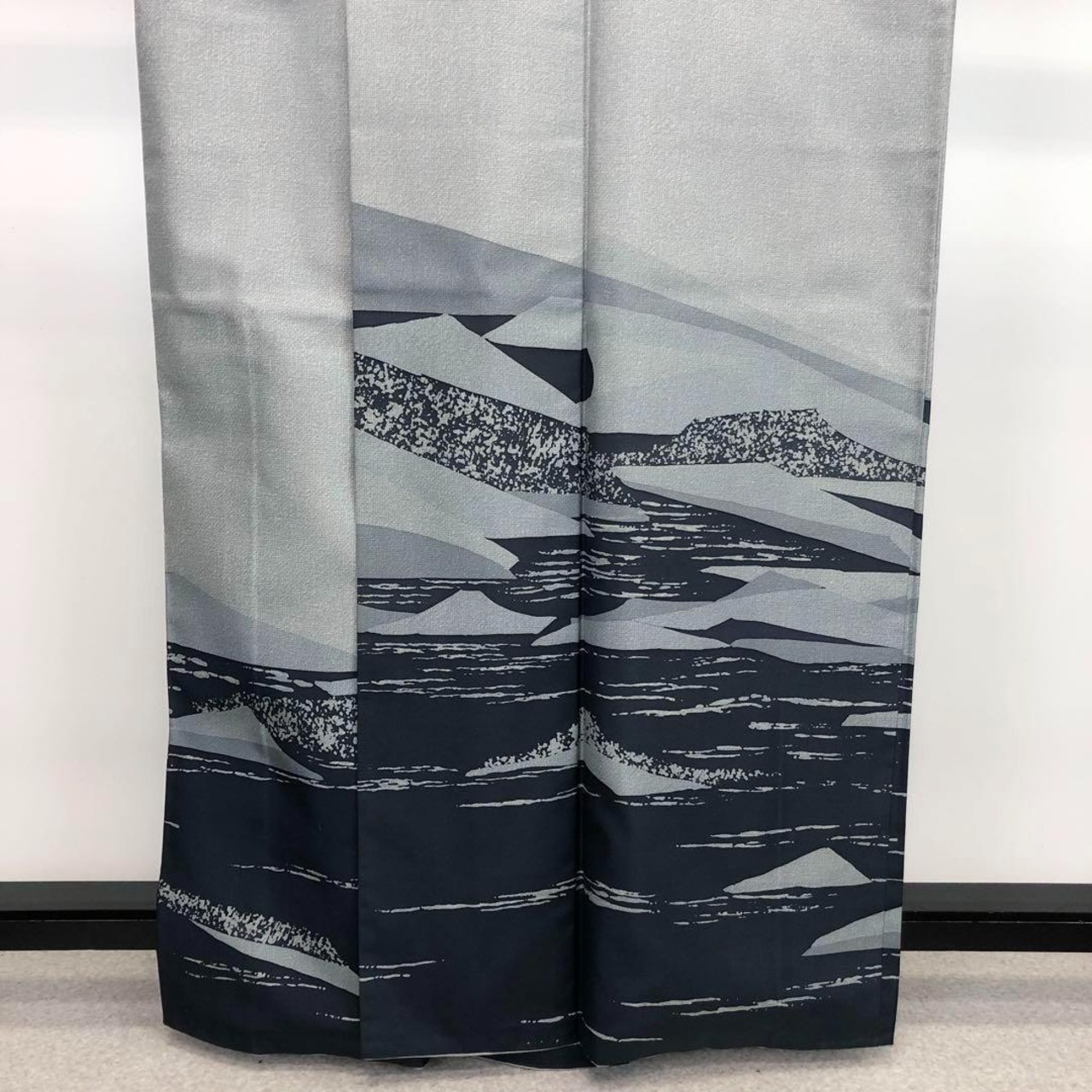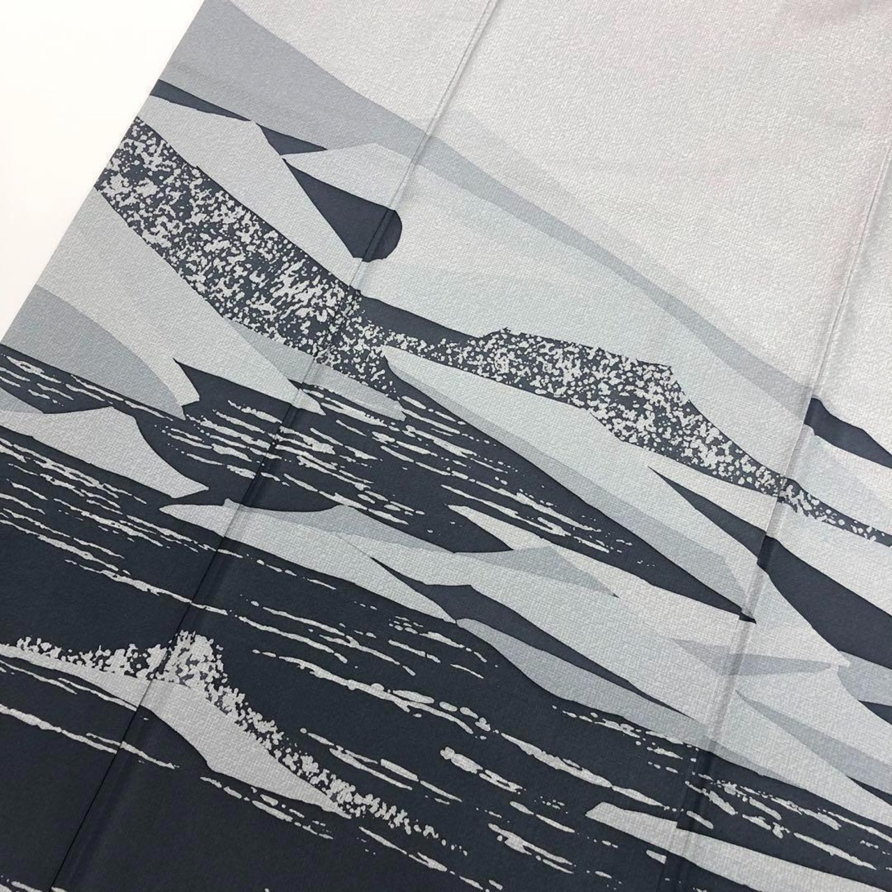 水銀色ベースのお色味に落ち着いある藍系のお色で染め上げられた彩大島と題された美しい柄裄のお品でございます。