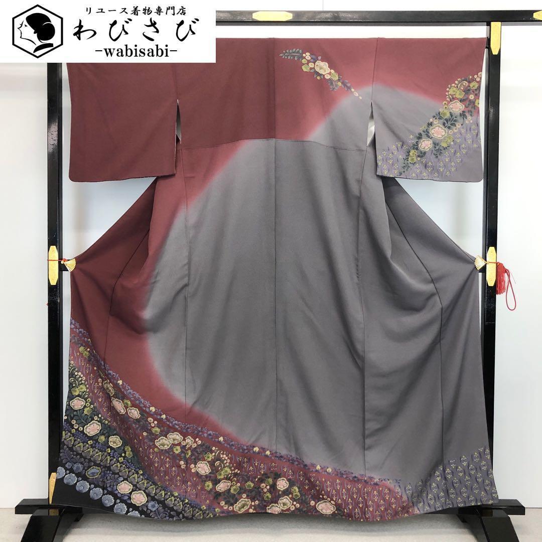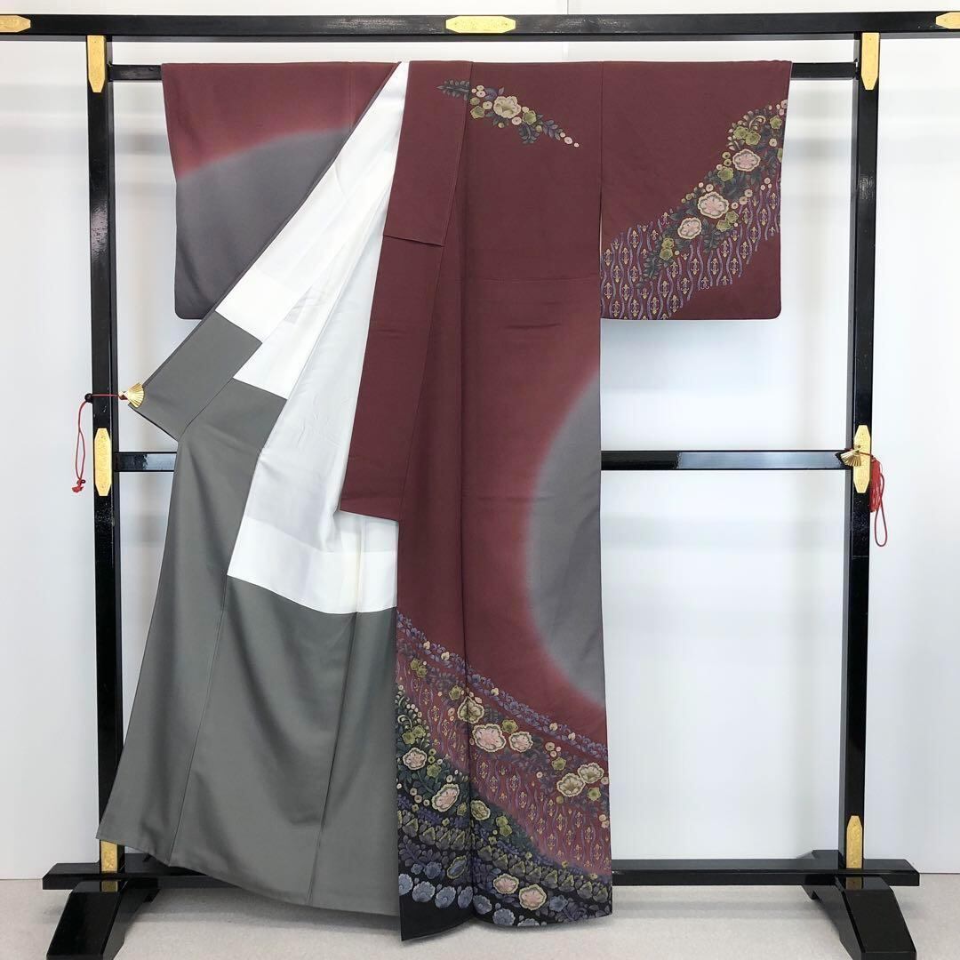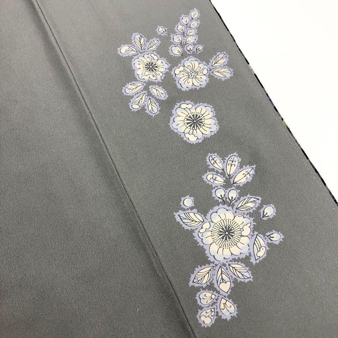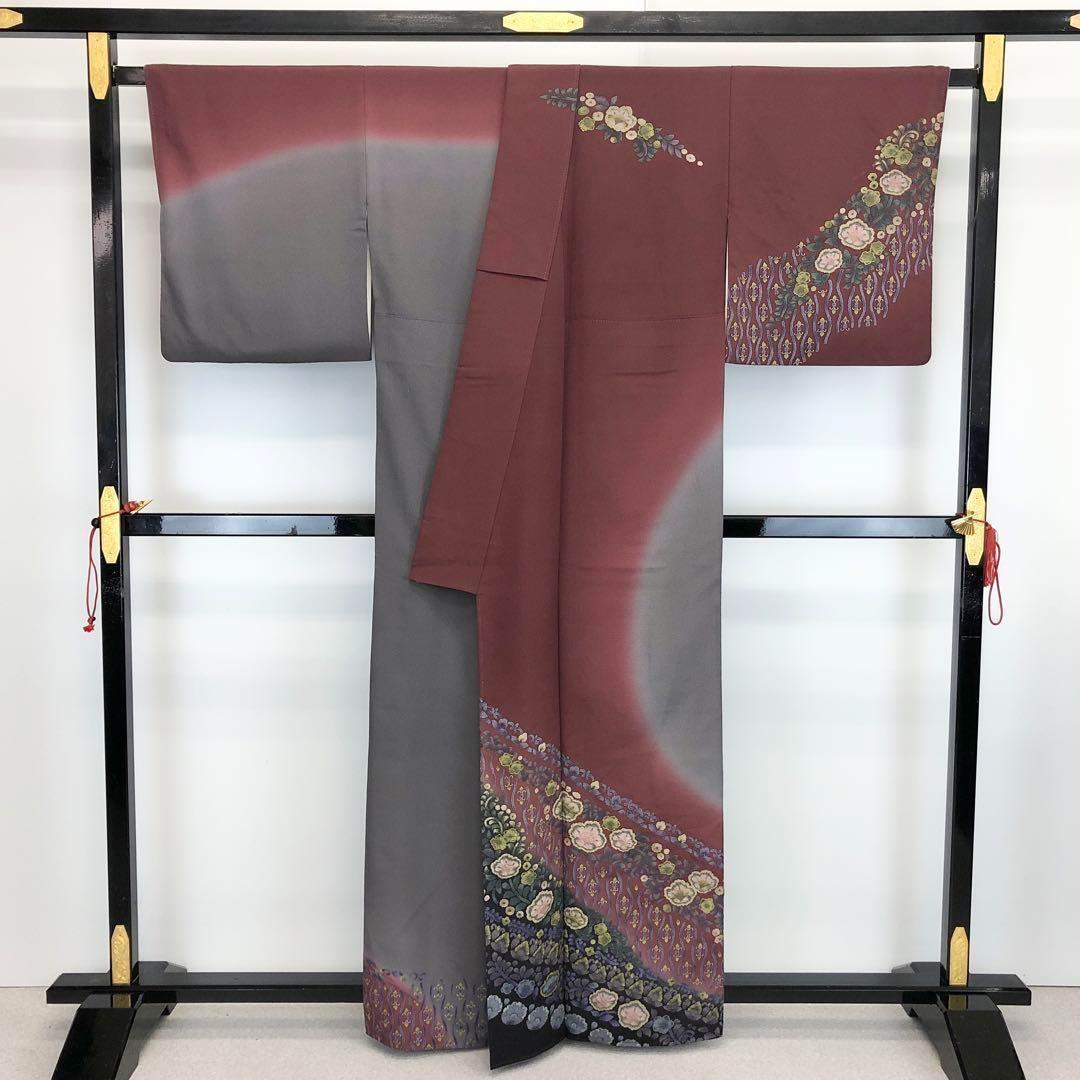 燻銀色の落ち着きのあるお色味ベースの染分けの縮緬、品のある美しい辻が花絞りがデザインされた素敵なお品でございます。