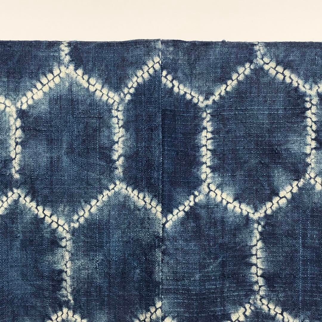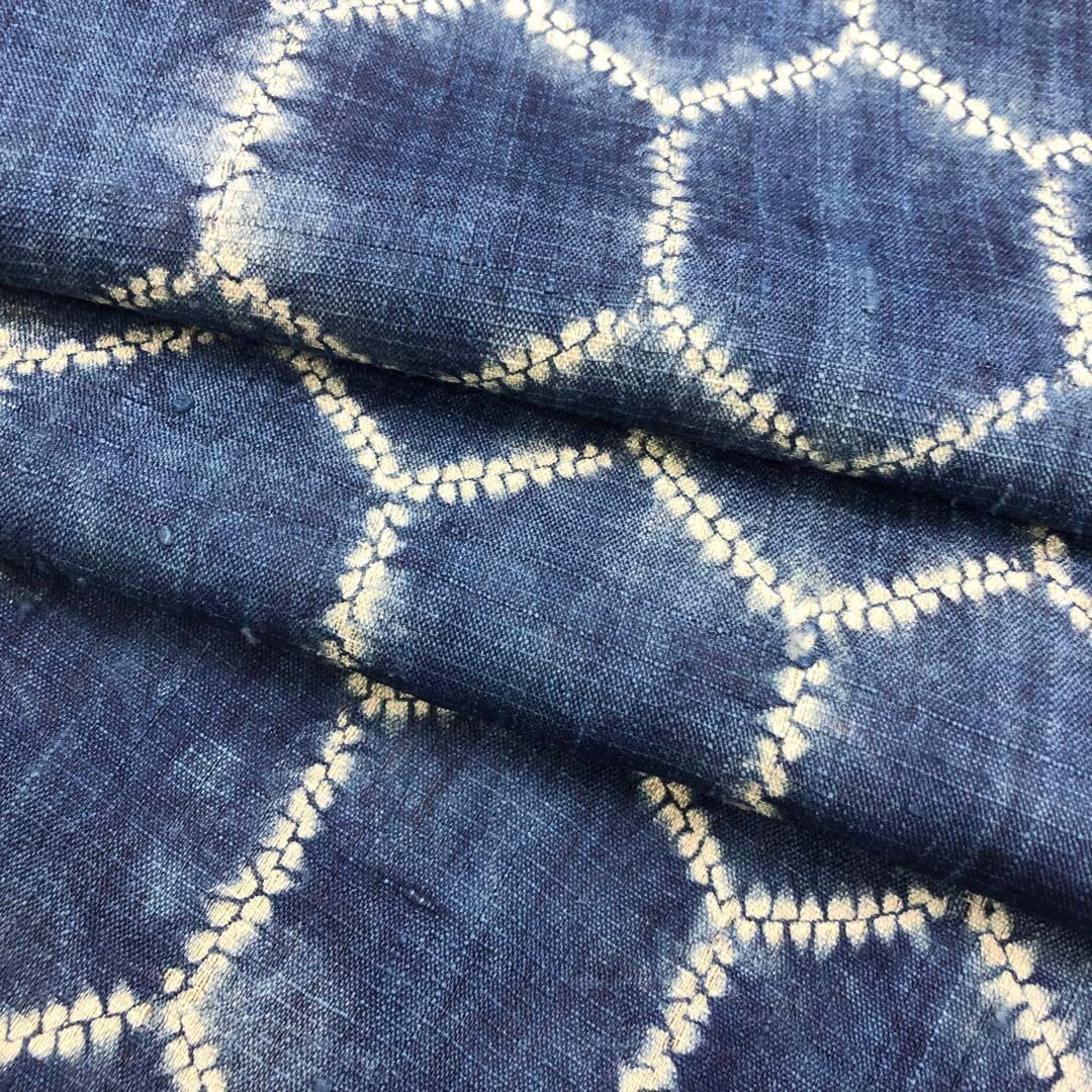 柔らかい手触りの良い紬地に藍染絞りで雰囲気の良い亀甲模様がデザインされた素敵なお品でございます。