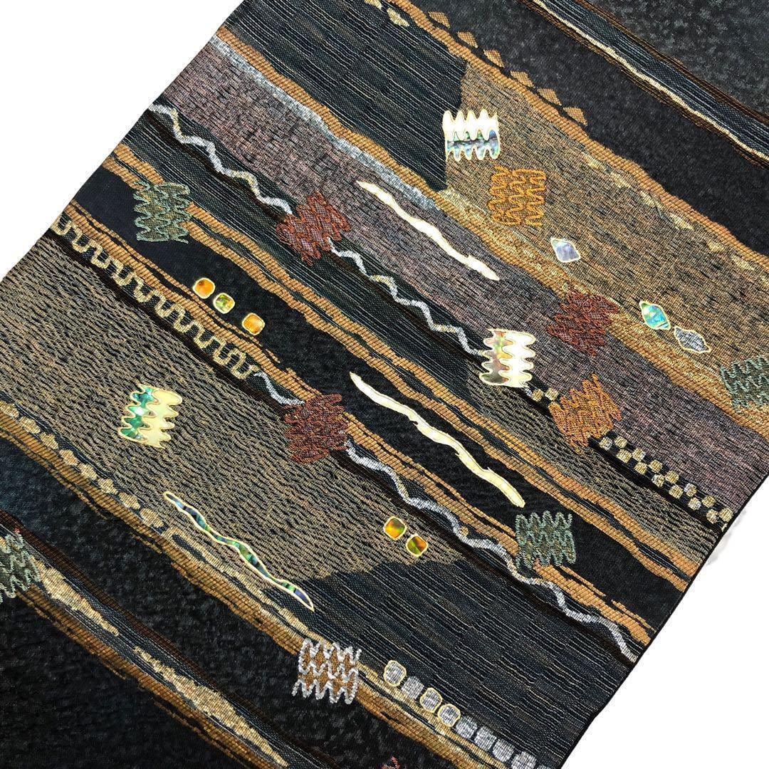 落ち着きのある鋼色のお色に螺鈿を使った横段抽象織模様がデザインされた素敵な柄行のお品でございます。