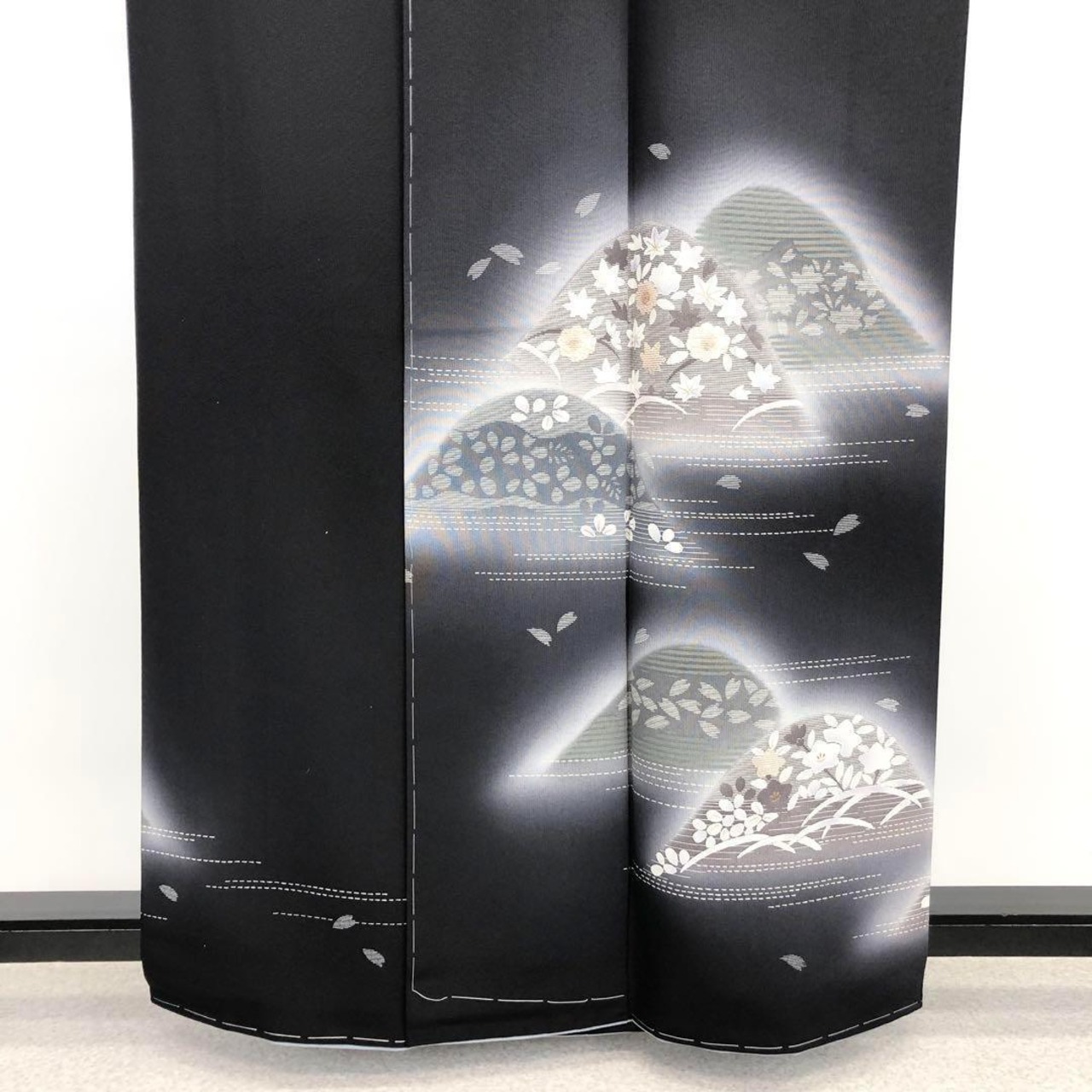 付下げ 遠山柄に花模様 桜 桔梗 竹屋町刺繍 青褐色 ガード加工 K-3415