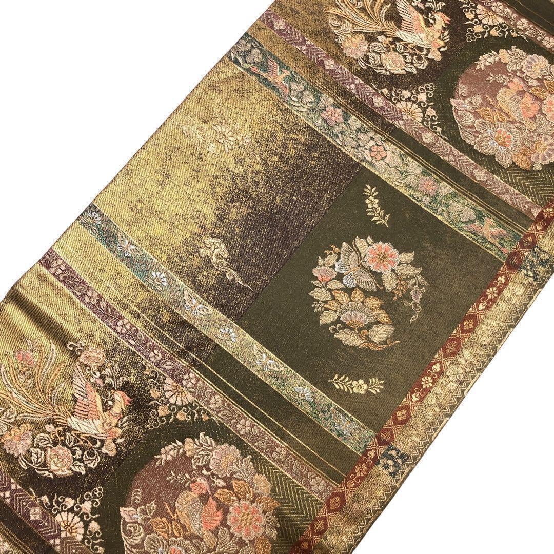 飛翔讃歌文と題された金糸の使われた丸に煌びやかで美しい華柄模様、鳳凰、蝶々、花唐草などがデザインされた素敵な柄裄のお品でございます。