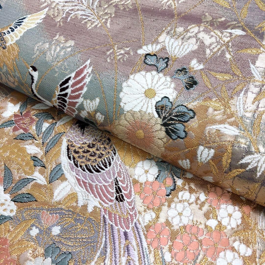 九百本金弐重織、献上波花鳥と題された金色のお色味ベースの色鮮やかな鳥と季節の花々の煌びやかな柄行が素敵なお品でございます。
