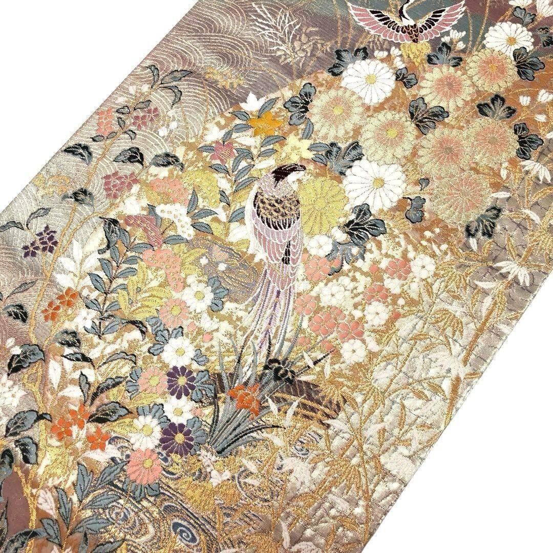 袋帯 九百本金弐重織 献上波花鳥 季節の美しい花模様に鳥 金糸 O-3299 着物 きもの kimono 和服 和装 中古 リサイクル着物 【送料無料】