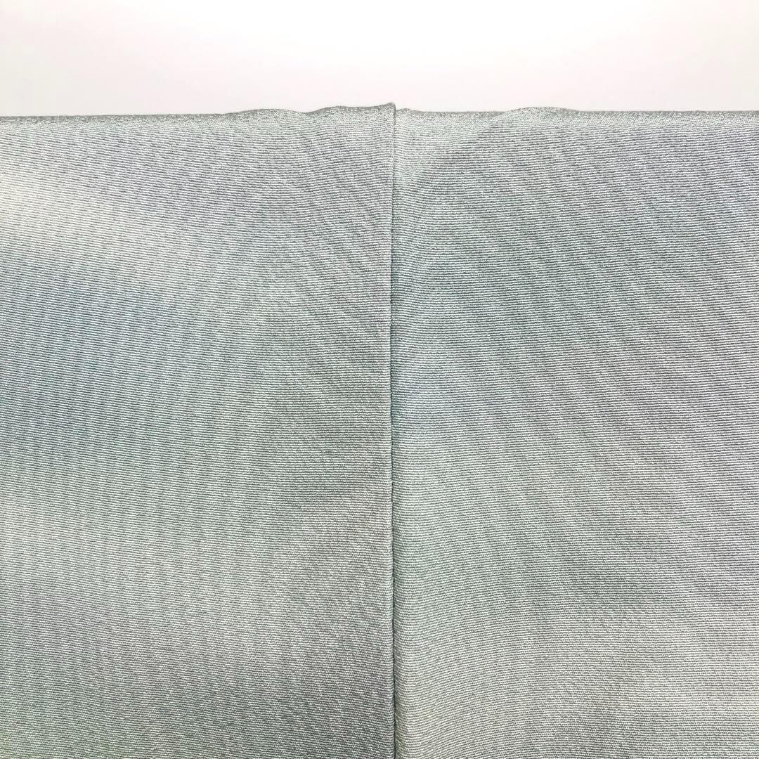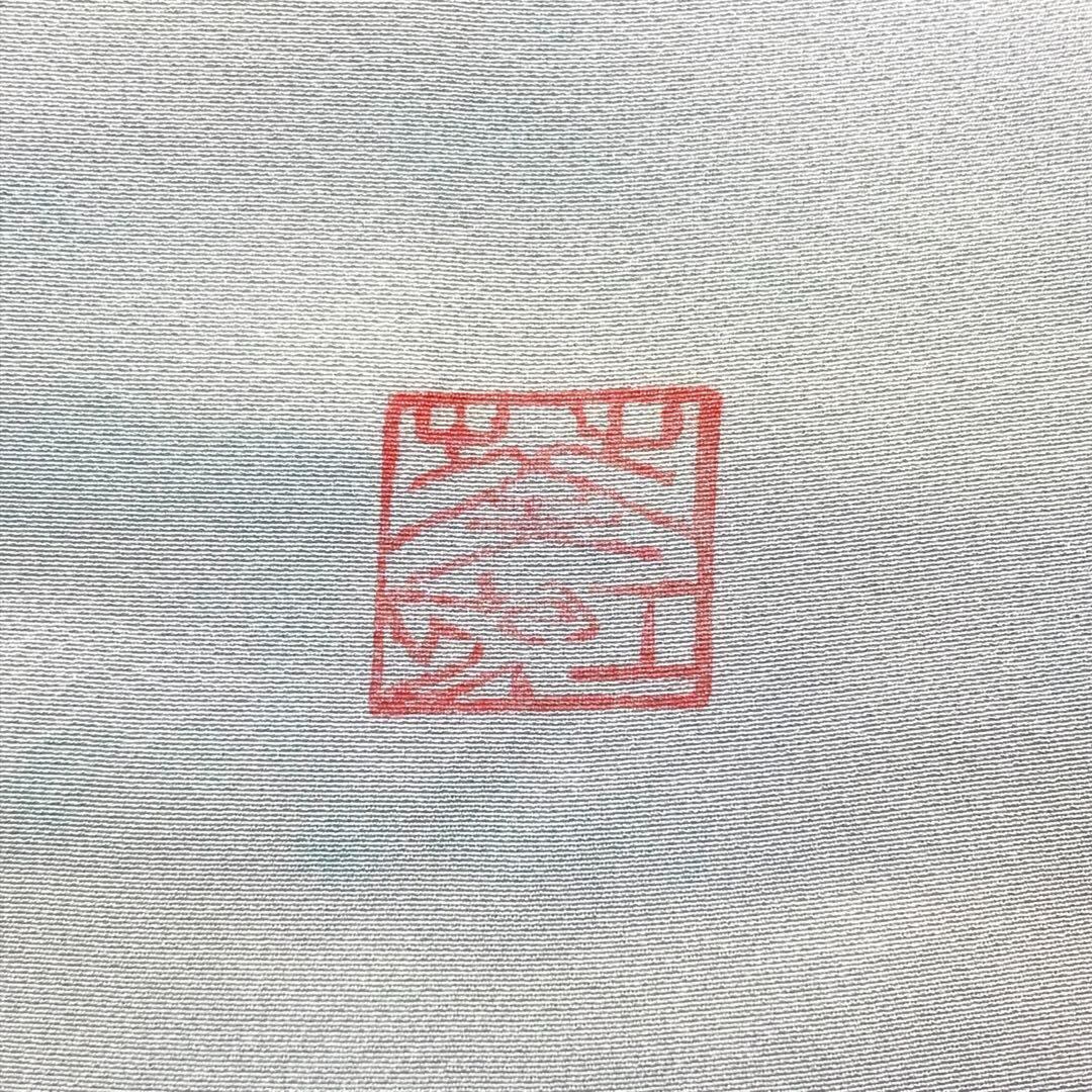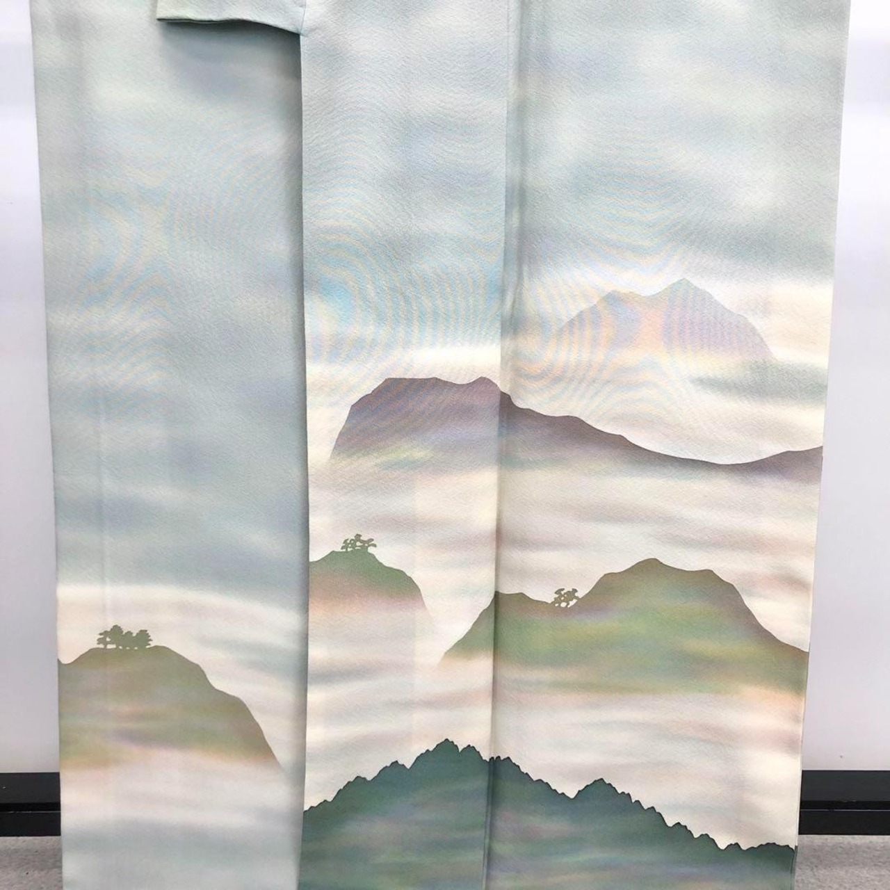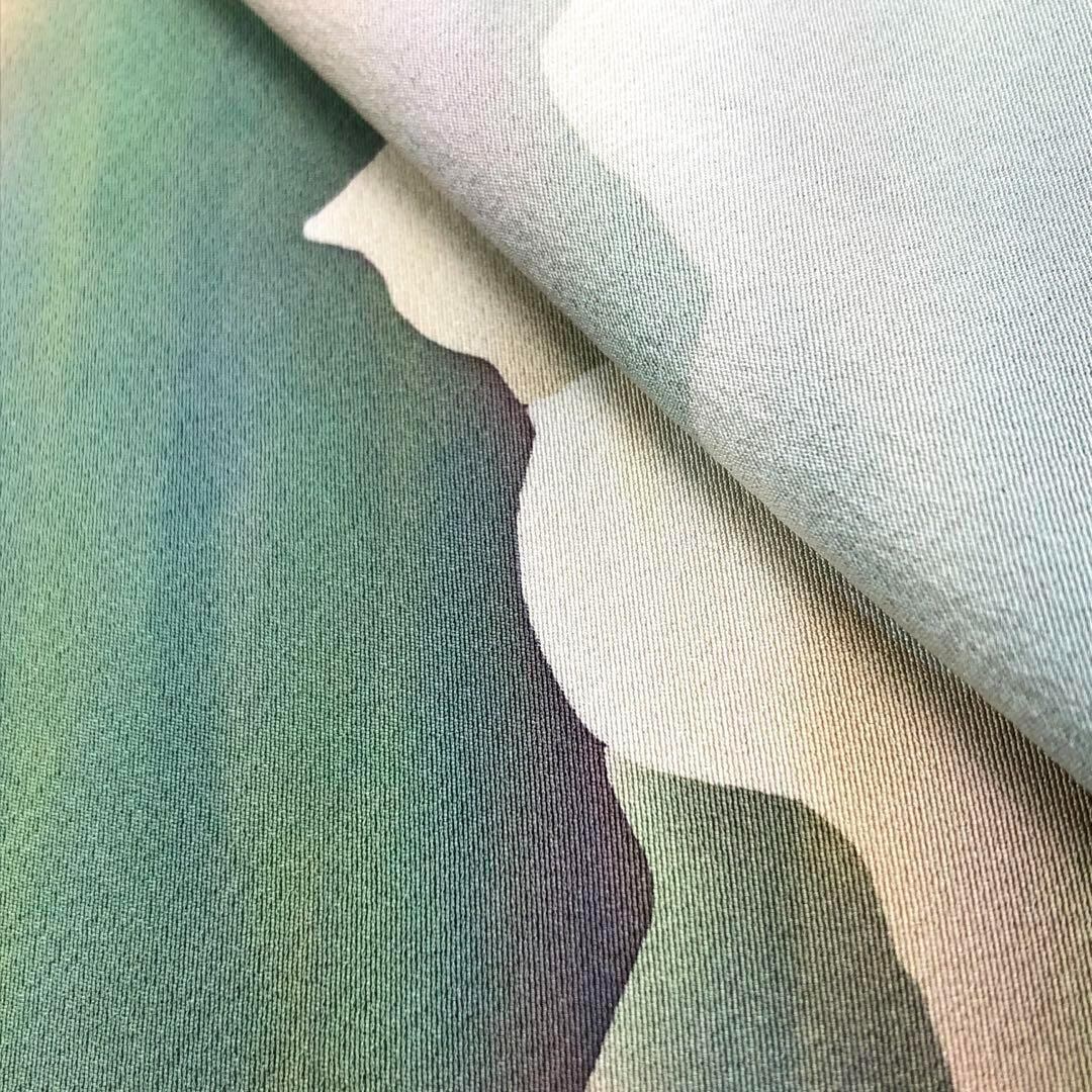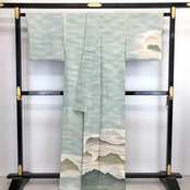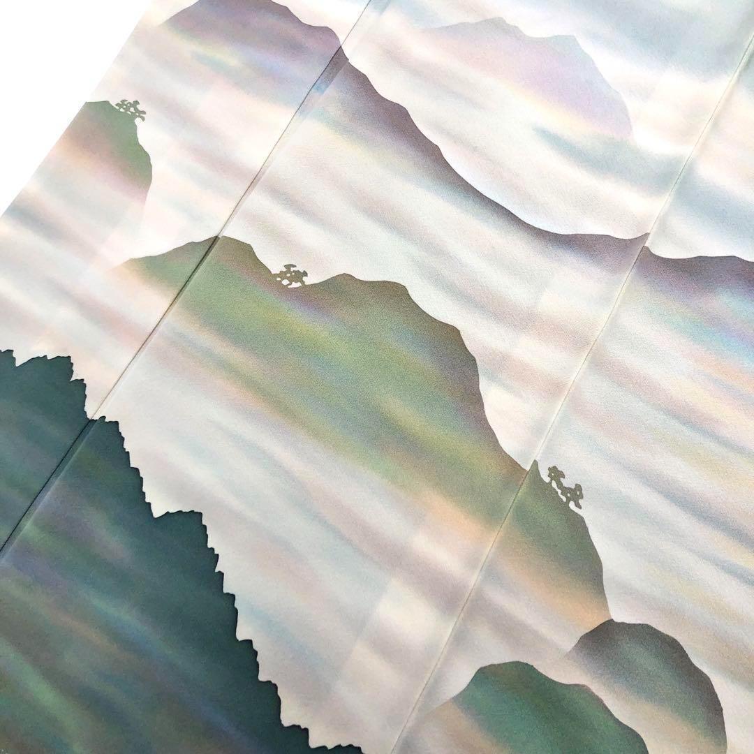 薄浅葱色の縮緬に染色の魔術といわれる虹染の美しい色彩、遠山雲海風景の柄行がデザインされた美しい色彩の素敵なお品でございます。