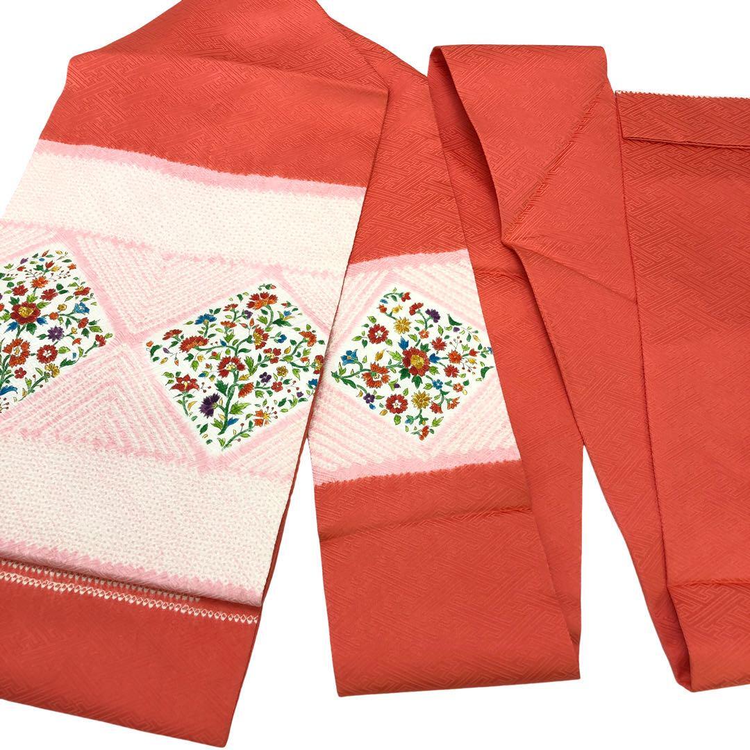 中紅色に紗綾形の地模様、鹿の子絞りの菱柄に染柄でデザインされた可愛らしい花模様が素敵なお品でございます。