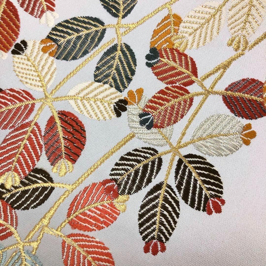 落ち着きのある灰白色に金銀糸を使った色彩豊かな枝葉模様の柄行がデザインされた素敵なお品でございます。